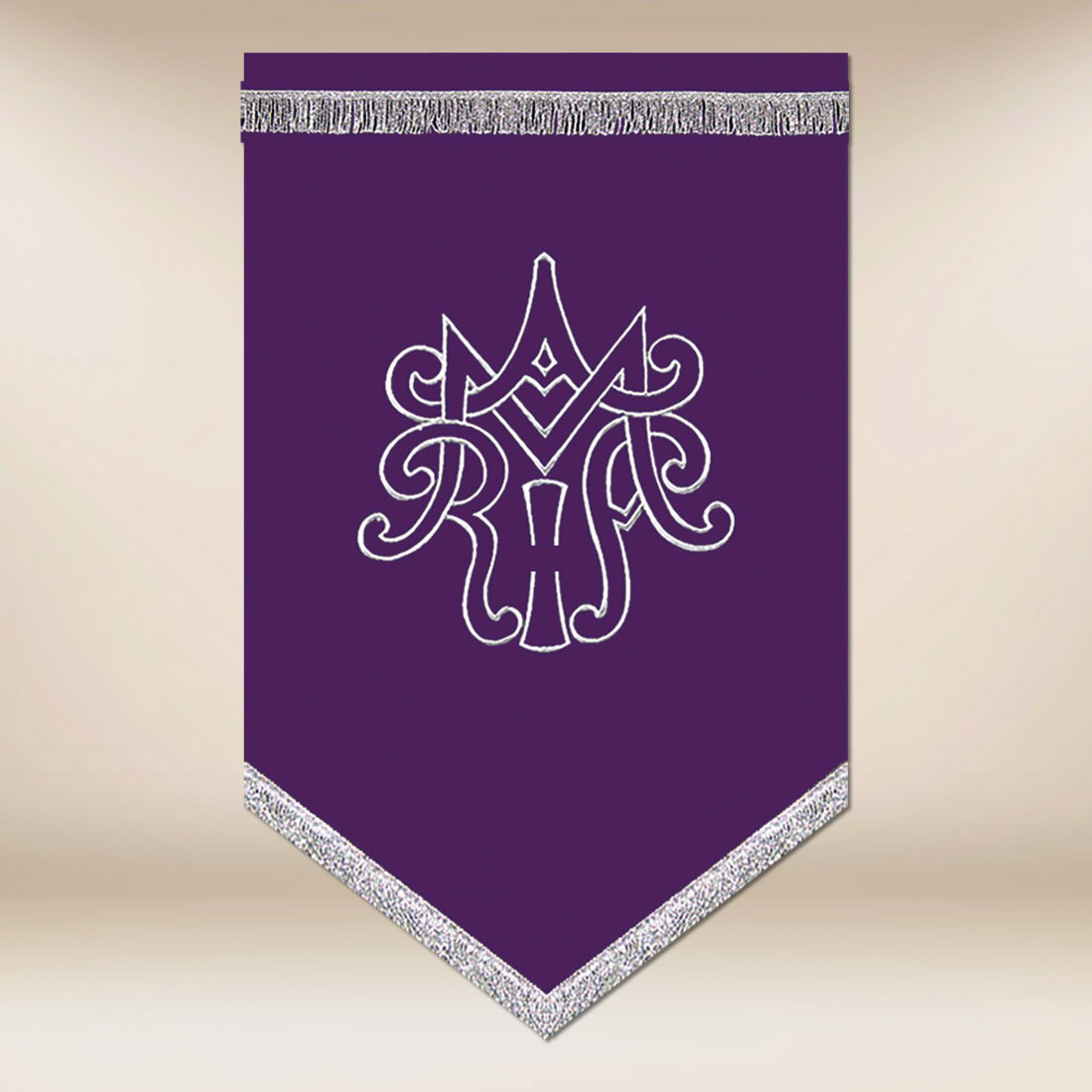 Il rovescio è decorato con un delicato monogramma mariano, che sottolinea la profondità spirituale e il simbolismo dello stendardo. Le decorazioni argentate e i delicati ornamenti creano una composizione coerente ed elegante, mantenendo al contempo serietà e moderazione.