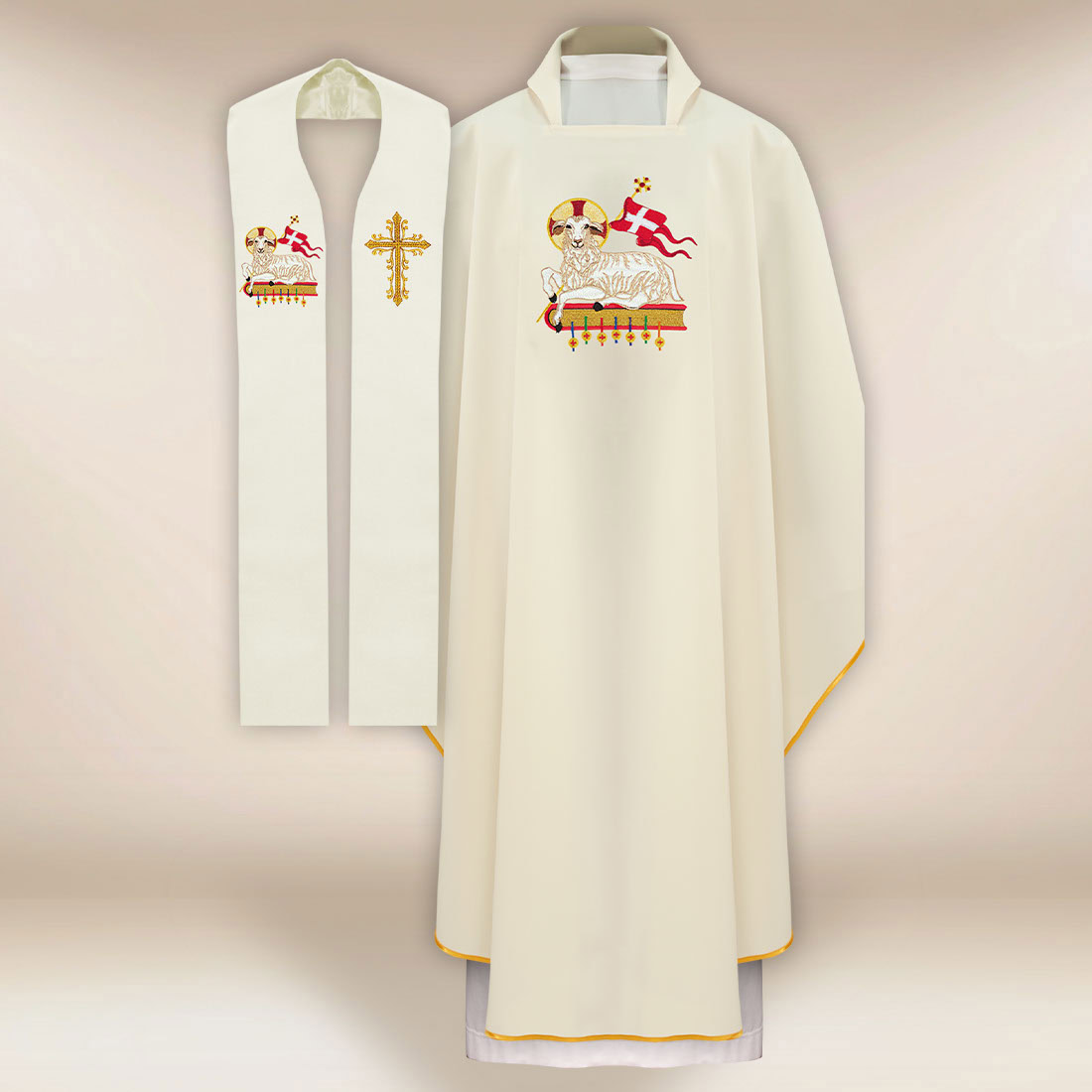 Completo casula e stola liturgica con simbolo dell’Agnello composto da casula e stola è stato progettato per i sacerdoti che desiderano unire la bellezza della simbologia eucaristica con la comodità dell’uso quotidiano. Il suo motivo centrale è l’Agnello ricamato – segno di Cristo, vincitore della Pasqua, presente nel Mistero Eucaristico. Questo simbolo, collocato su uno sfondo di croce e bandiera di trionfo, introduce nella celebrazione una profondità teologica e un tono pasquale gioioso. Grazie a ciò, il completo casula e stola liturgica con simbolo dell’Agnello diventa una scelta unica per le festività, le processioni e le celebrazioni parrocchiali.