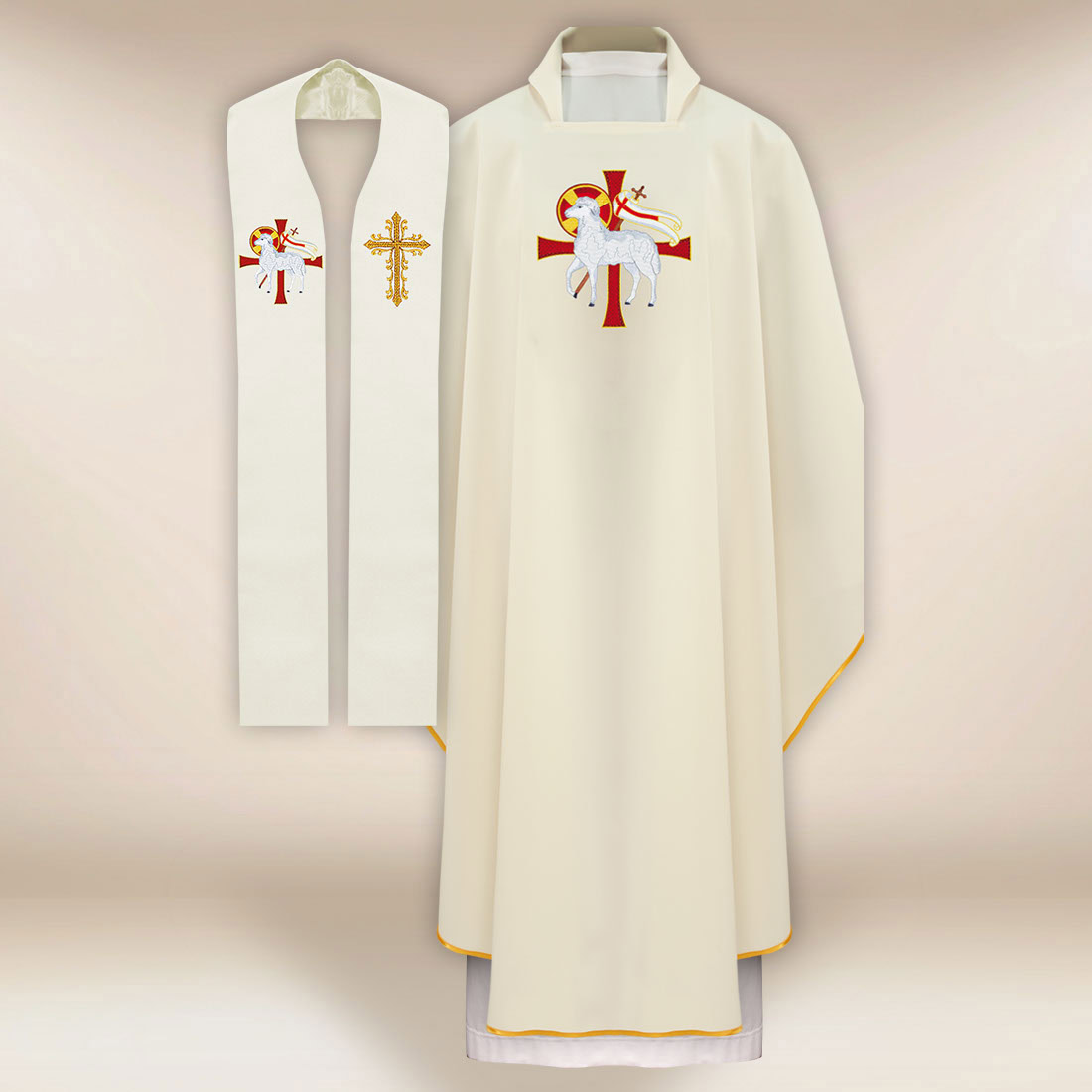 Completo casula e stola liturgica con simbolo dell’Agnello composto da casula e stola è stato progettato per i sacerdoti che desiderano unire la bellezza della simbologia eucaristica con la comodità dell’uso quotidiano. Il suo motivo centrale è l’Agnello ricamato – segno di Cristo, vincitore della Pasqua, presente nel Mistero Eucaristico. Questo simbolo, posto sullo sfondo di una croce e di una bandiera di trionfo, introduce nella celebrazione una profondità teologica e un tono pasquale gioioso. Grazie a ciò, il completo casula e stola liturgica con simbolo dell’Agnello diventa una scelta unica per le festività, le processioni e le celebrazioni parrocchiali.
