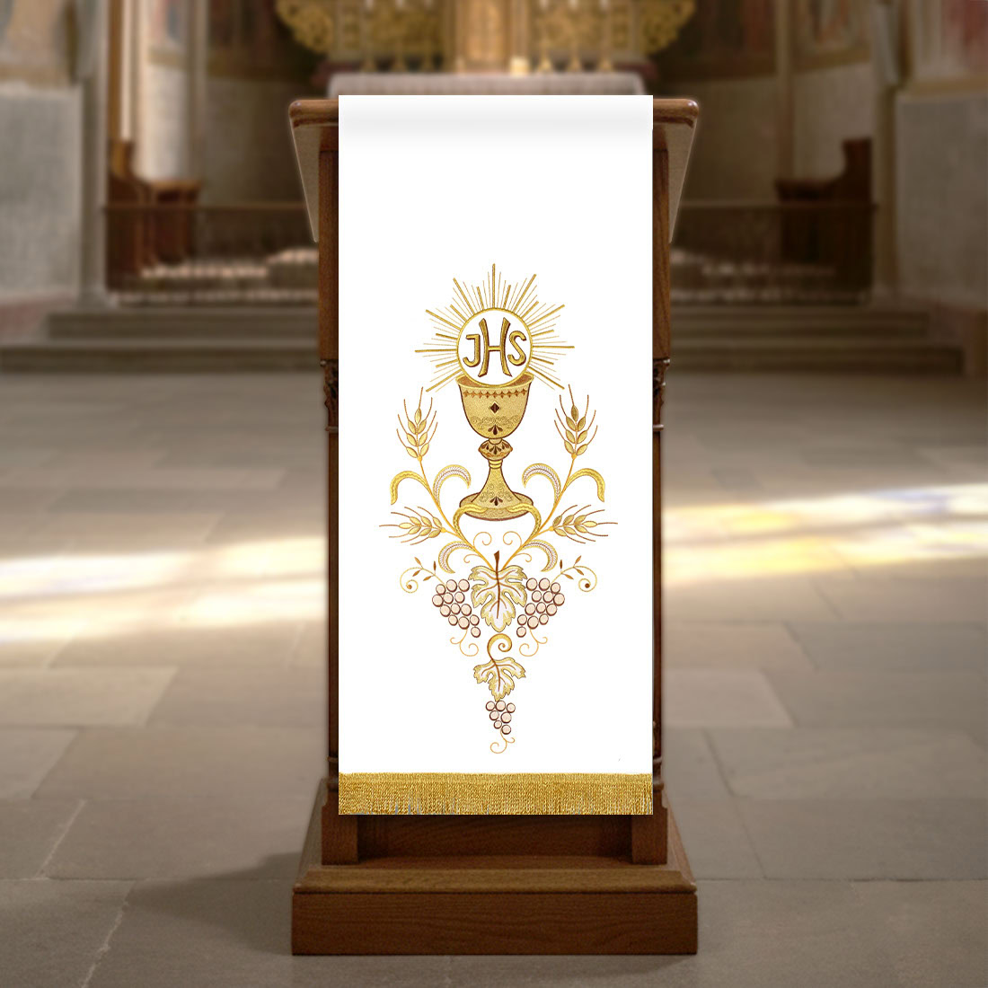 Decorato con un ricamo chiaro di simbologia eucaristica, rifinito con frange dorate, porta ordine, dignità e un’armonica decorazione liturgica nel presbiterio.