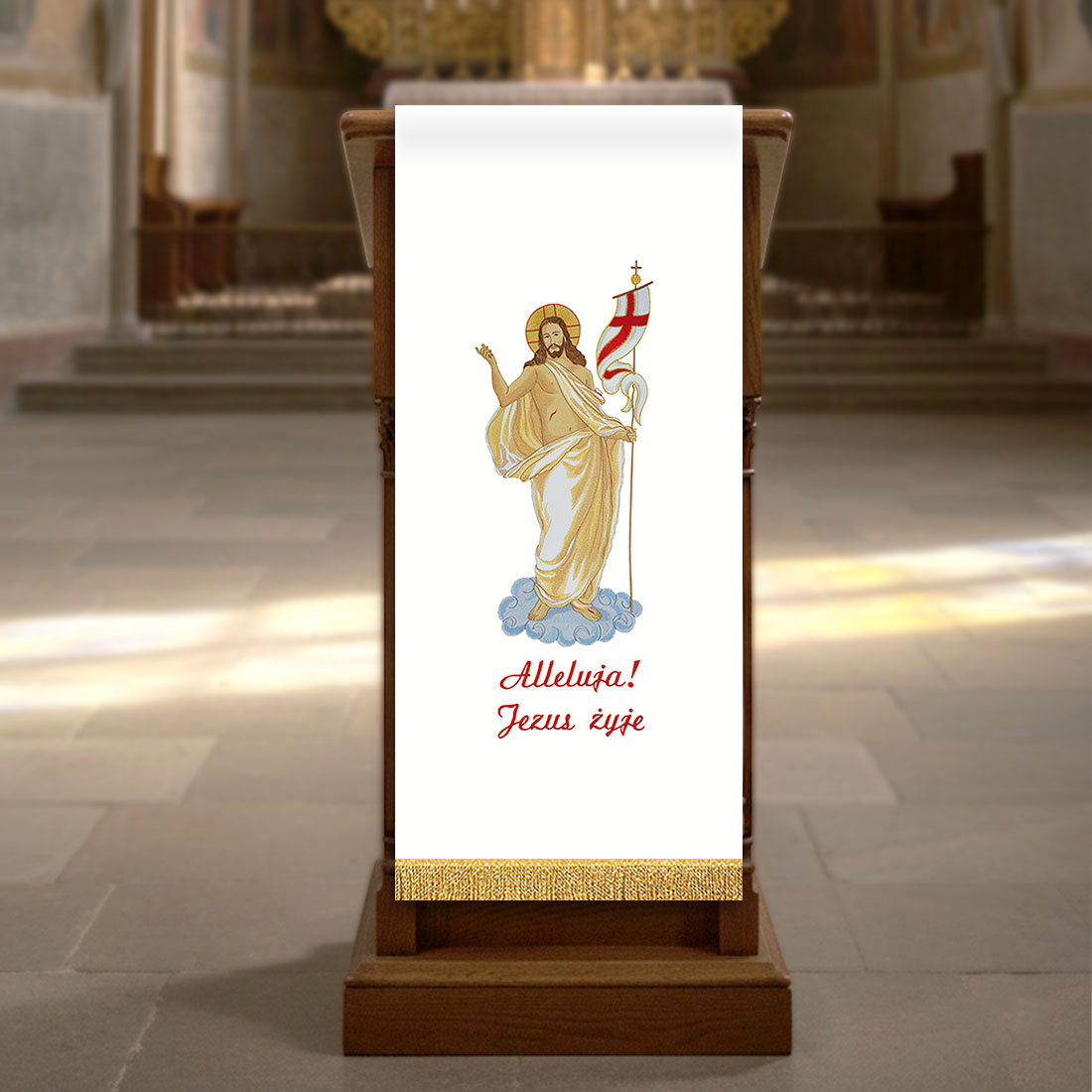 Coprileggio ricamato Gesù Risorto è un’eccezionale decorazione liturgica che introduce nella chiesa un’atmosfera gioiosa e pasquale. Come ornamento del leggio, sottolinea la verità fondamentale della fede: la vittoria di Cristo sulla morte e il dono della nuova vita. Coprileggio ricamato Gesù Risorto completa splendidamente l’arredamento del tempio durante il periodo pasquale, creando un’adeguata e dignitosa cornice per la celebrazione.
