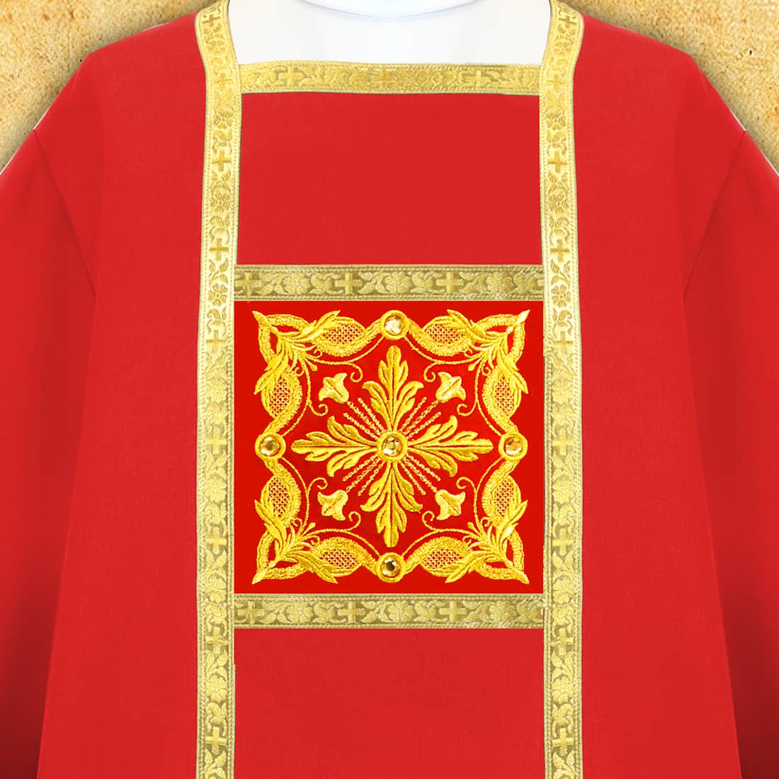 Nella parte centrale della composizione è particolarmente visibile la proporzione del ricamo, ben bilanciata, grazie alla quale la dalmatica liturgica rossa ricamata mantiene il suo carattere cerimoniale, senza perdere la semplicità liturgica. La combinazione di design classico, eleganza e durata rende questo modello una scelta eccellente per i diaconi in cerca di un abito che sottolinei l’importanza delle celebrazioni.