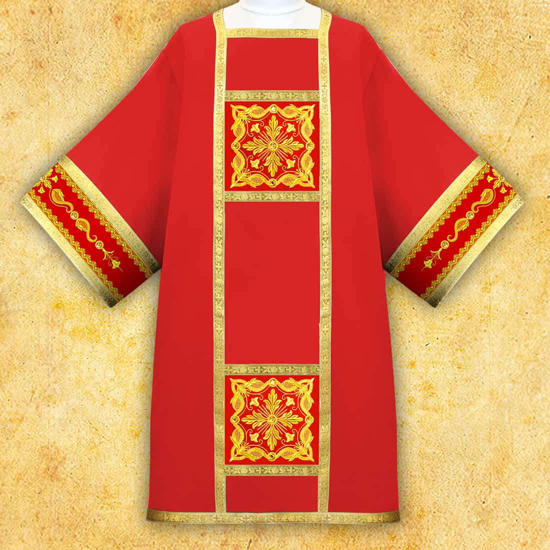 Dalmatica liturgica in una tonalità di rosso profondo, decorata con un preciso ricamo dorato di carattere ornamentale.