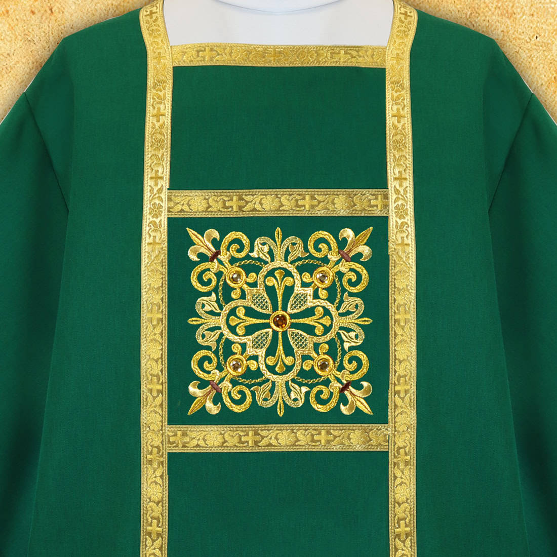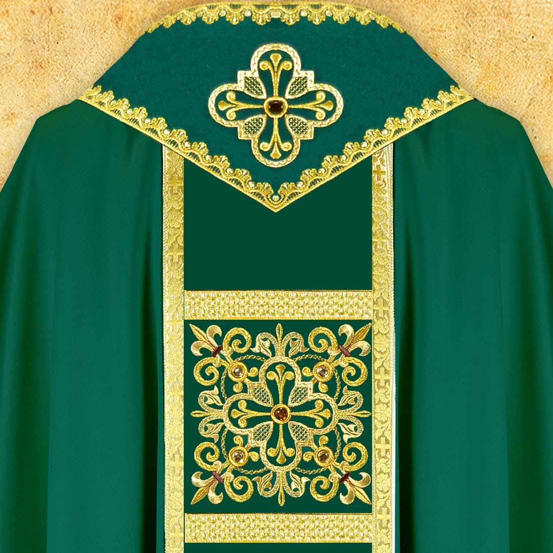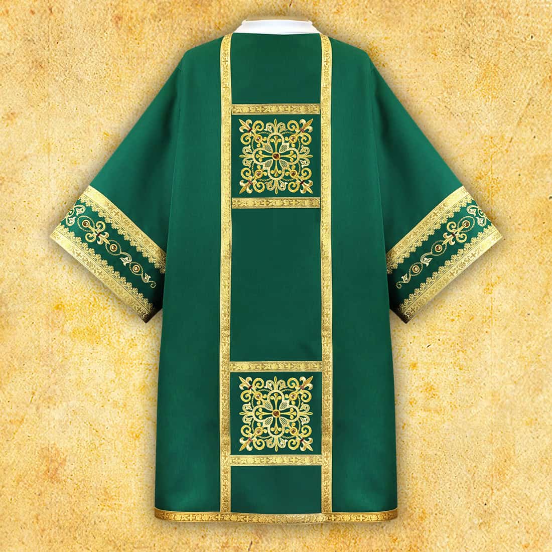 Dalmatica liturgica verde ricamata è un abito destinato al diacono, che unisce eleganza, simbolismo classico e alta estetica liturgica. Il verde, conforme al periodo ordinario dell’anno liturgico, porta con sé il significato di speranza, crescita e umile servizio quotidiano della Chiesa. La tonalità è stata scelta per presentarsi armoniosamente nel presbiterio, sia alla luce naturale che artificiale.