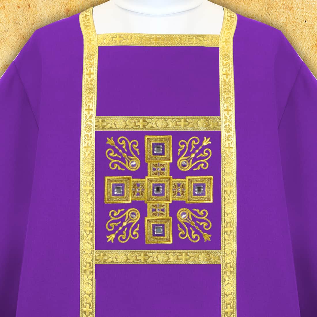 Dalmatica liturgica viola ricamata è un’elegante veste ricca di simbolismo destinata al diacono, creata per celebrazioni che richiedono concentrazione, penitenza e riflessione spirituale. Il viola da secoli rappresenta il colore dei periodi penitenziali, pertanto questa veste si inserisce perfettamente nella liturgia della Quaresima e dell’Avvento, così come in tutte le celebrazioni di carattere devozionale. Il suo aspetto solenne è sottolineato sia dalla scelta del materiale che dalla cura nella realizzazione del ricamo.