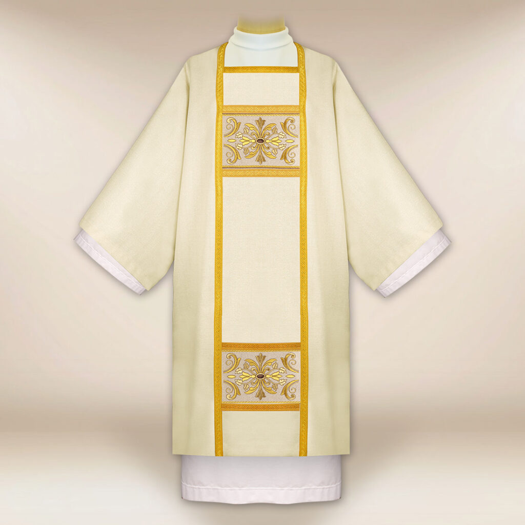 Dalmatica ricamata ecru è una veste liturgica solenne ed elegante destinata al diacono, realizzata in tessuto di alta qualità di tonalità chiara e luminosa. Il bianco e l’ecru sono da secoli associati nella liturgia alla purezza, alla gioia, alla nuova vita e alla presenza della luce divina — perciò questa veste si adatta perfettamente alle Messe solenni, alle festività, ai battesimi, ai matrimoni e alle celebrazioni di ringraziamento.
