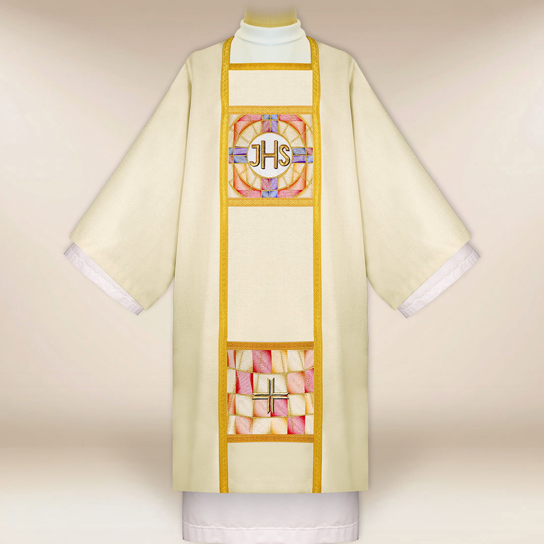 L’elemento decorativo centrale è una fascia verticale decorativa con un ricamo riccamente elaborato. Nella parte superiore è collocato il simbolo IHS, che è un tradizionale cristogramma eucaristico, che da secoli rappresenta il segno della presenza di Cristo nel Santissimo Sacramento. La parte inferiore è arricchita da un sottile motivo di croce, che completa l’intera composizione e conferisce alla veste un profondo significato liturgico.