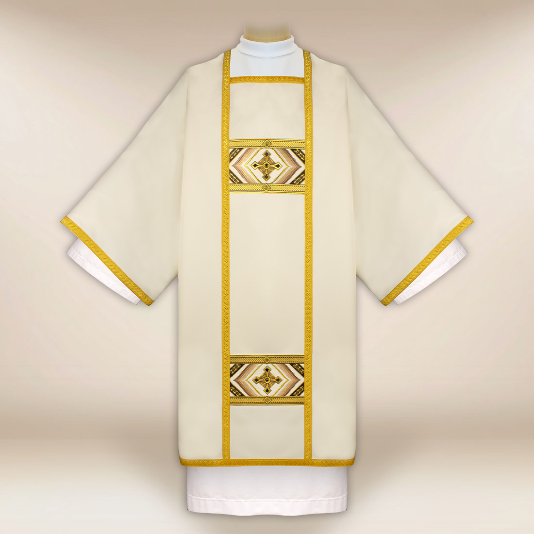 La parte anteriore della dalmatica è decorata con un pannello verticale con ricco ricamo simmetrico in tonalità dorate. L’ornamento è stato progettato per mantenere un equilibrio tra eleganza e sobrietà liturgica. Il filo dorato crea motivi di croci e delicati elementi vegetali, conferendo alla veste profondità e armonia sacra. Le maniche sono adornate con ampi polsini ricamati, che completano armoniosamente l’intera composizione.