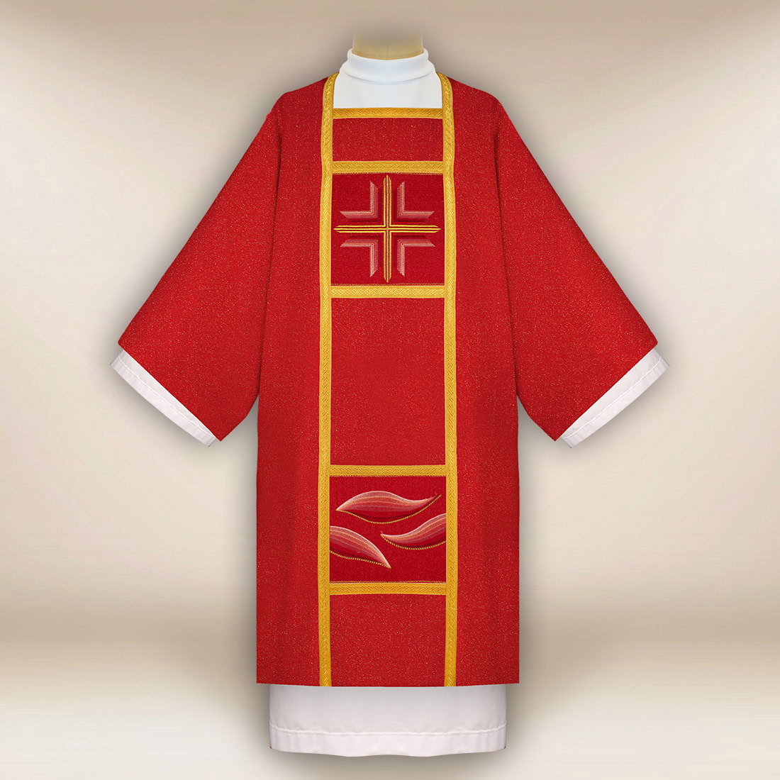 Nella parte centrale della composizione è particolarmente visibile la proporzione del ricamo, grazie alla quale la dalmatica liturgica rossa ricamata mantiene il suo carattere cerimoniale, senza perdere la semplicità liturgica. La combinazione di design classico, eleganza e durata rende questo modello una scelta eccellente per i diaconi in cerca di un abito che sottolinei l’importanza delle celebrazioni.