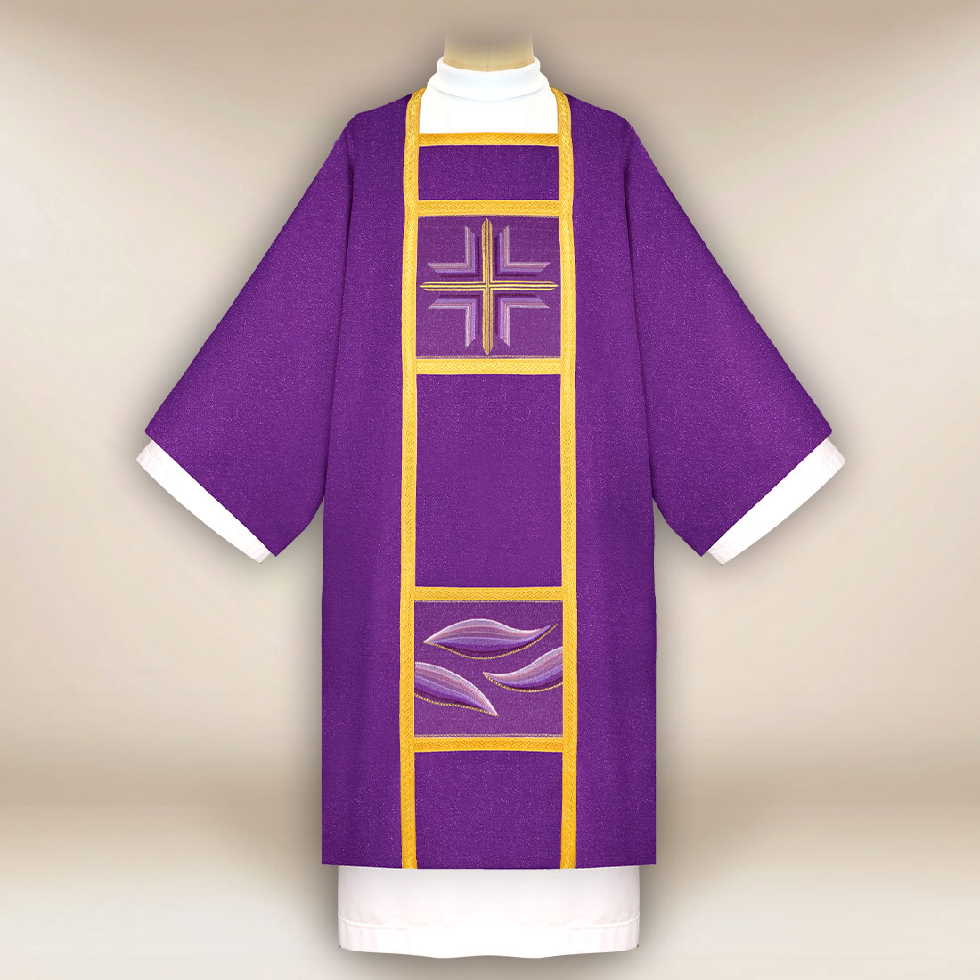 Dalmatica liturgica viola ricamata è una veste elegante, ricca di simbolismo, destinata al diacono, creata per celebrazioni che richiedono concentrazione, penitenza e riflessione spirituale. Il viola da secoli rappresenta il colore dei periodi penitenziali, pertanto questa veste si inserisce perfettamente nella liturgia della Quaresima e dell’Avvento, nonché in tutte le celebrazioni di carattere orante. Il suo aspetto solenne è accentuato sia dalla scelta del materiale che dalla cura nella realizzazione del ricamo.