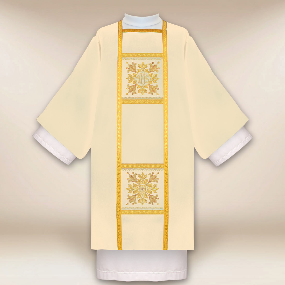La parte anteriore della dalmatica è decorata con un pannello verticale con un ricco ricamo simmetrico in tonalità dorate. L’ornamento è stato progettato per mantenere un equilibrio tra eleganza e sobrietà liturgica. Il filo dorato crea motivi di croci e delicati elementi vegetali, conferendo alla veste profondità e armonia sacra. Le maniche sono adornate con ampi polsini ricamati, che completano coerentemente l’intera composizione.