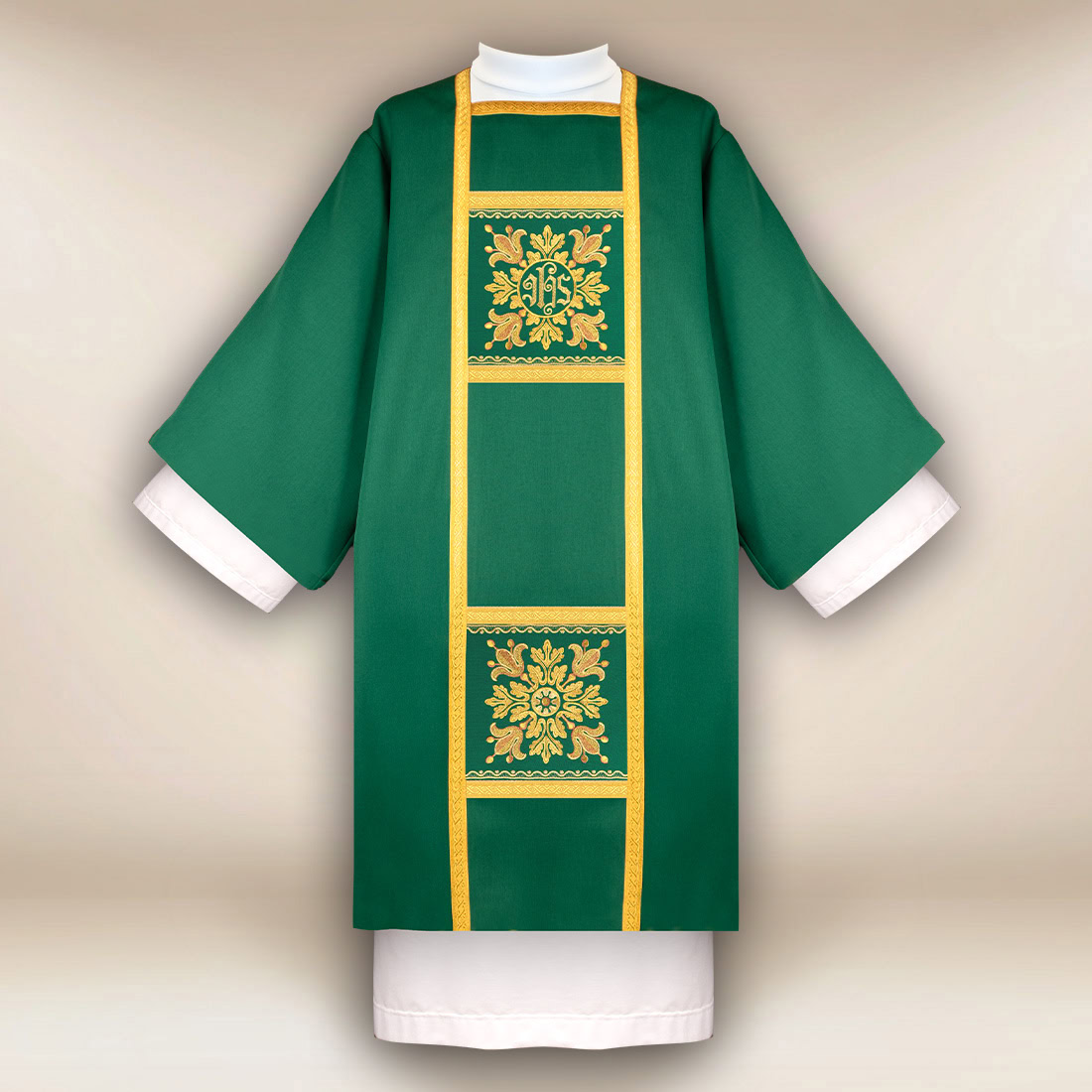 Dalmatica ricamata verde con croci è una veste liturgica solenne ed elegante destinata al diacono, realizzata in tessuto di alta qualità con una tonalità chiara e luminosa. Il verde, conforme al periodo ordinario dell’anno liturgico, porta con sé il significato di speranza, crescita e servizio quotidiano e umile della Chiesa. La tonalità è stata scelta per presentarsi armoniosamente nel presbiterio, sia alla luce naturale che artificiale.