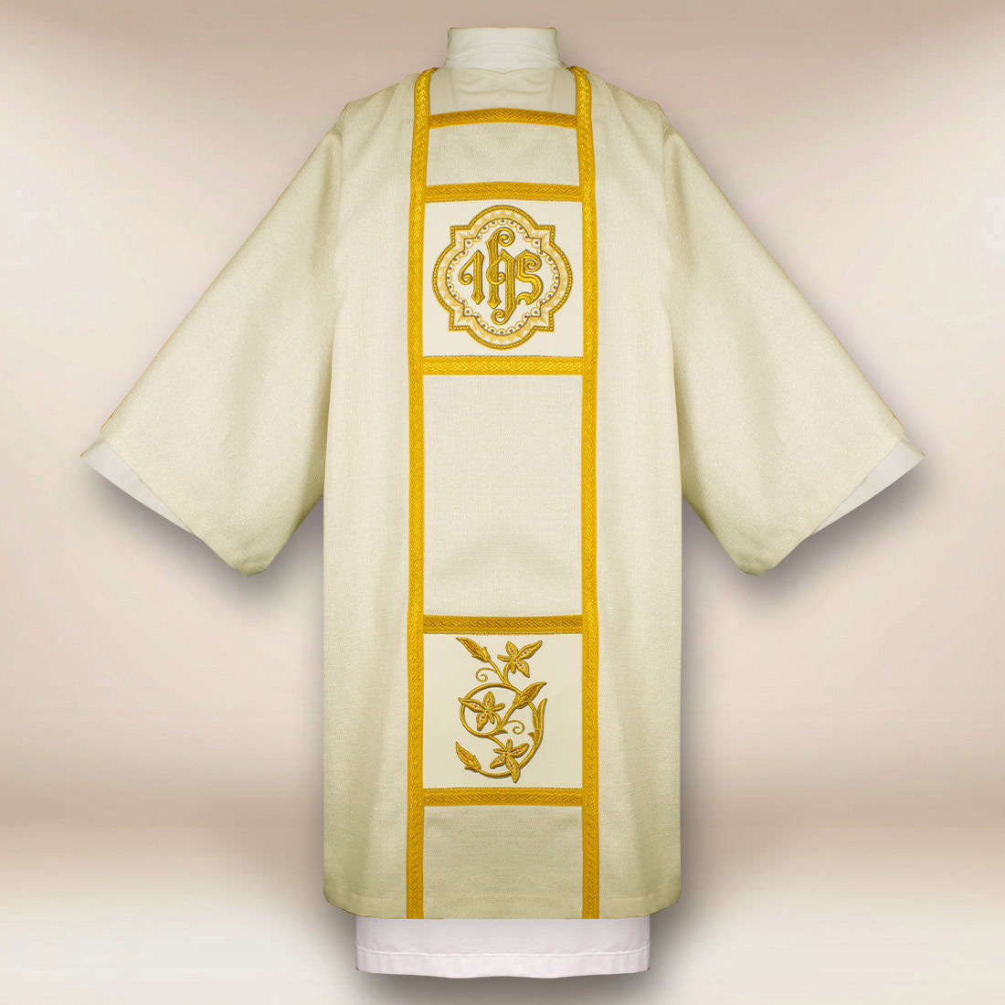 Ogni dalmatica ricamata ecru con IHS è realizzata presso l’atelier Urbanowicz Haft Polska, dove la tradizione dell’artigianato liturgico si unisce alla precisione di esecuzione. Ricami accuratamente realizzati, fili durevoli e finiture precise fanno sì che la veste mantenga il suo aspetto rappresentativo per molti anni.