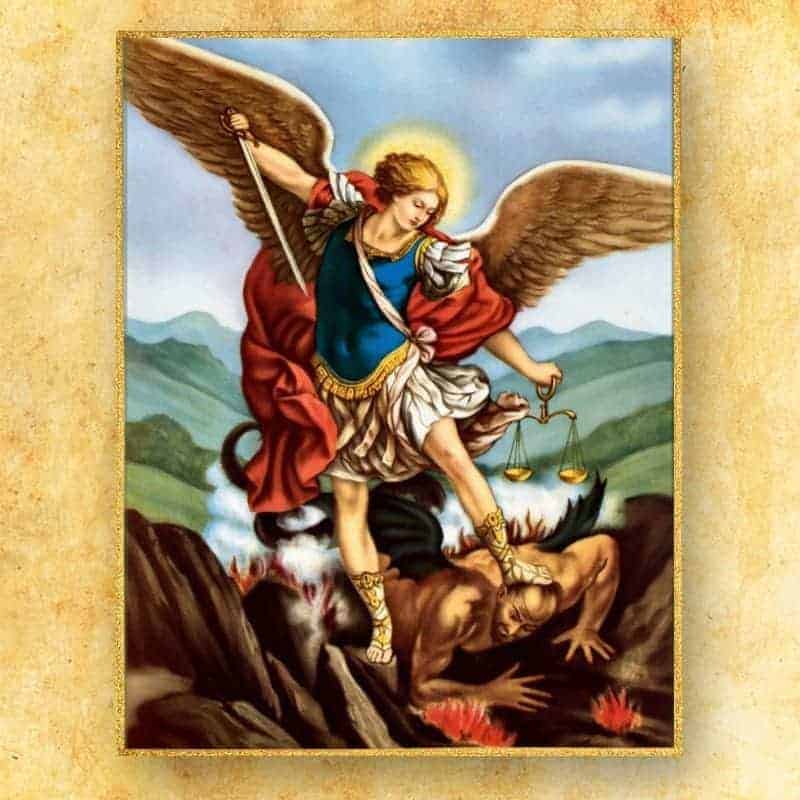 Decorazione liturgica di San Michele Arcangelo rappresenta un potente guerriero spirituale che si erge a difesa del bene e della verità. L’immagine classica, in cui l’Arcangelo calpesta il male e tiene in mano la bilancia della giustizia e la spada, ricorda la forza della preghiera, la responsabilità e la fiducia nella protezione divina. È un bellissimo accento per il presbiterio, le cappelle, le aule catechistiche e gli spazi di preghiera parrocchiale.