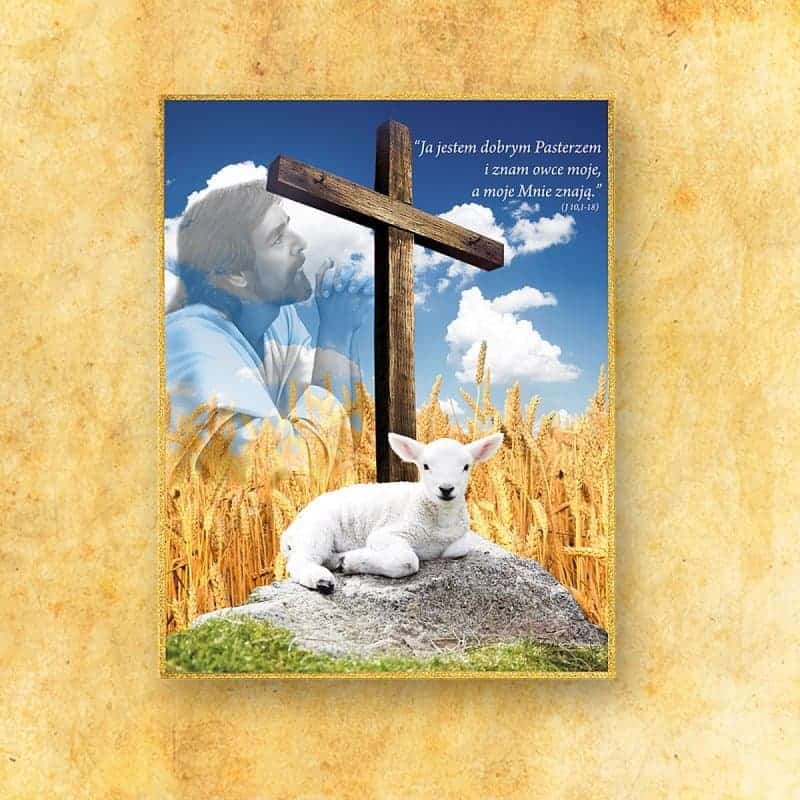 L’agnello indica Cristo, che dona la vita per portare pace al mondo. La croce — simbolo di salvezza — inscritta sullo sfondo del cielo azzurro, ricorda la speranza e la resurrezione. La citazione biblica “Io sono il buon Pastore” sottolinea la vicinanza e la cura che il Signore mostra a chiunque si fida di Lui. Questa composizione aiuta i fedeli a entrare in un’esperienza più profonda della liturgia, specialmente nel periodo pasquale, durante ritiri o adorazioni.
