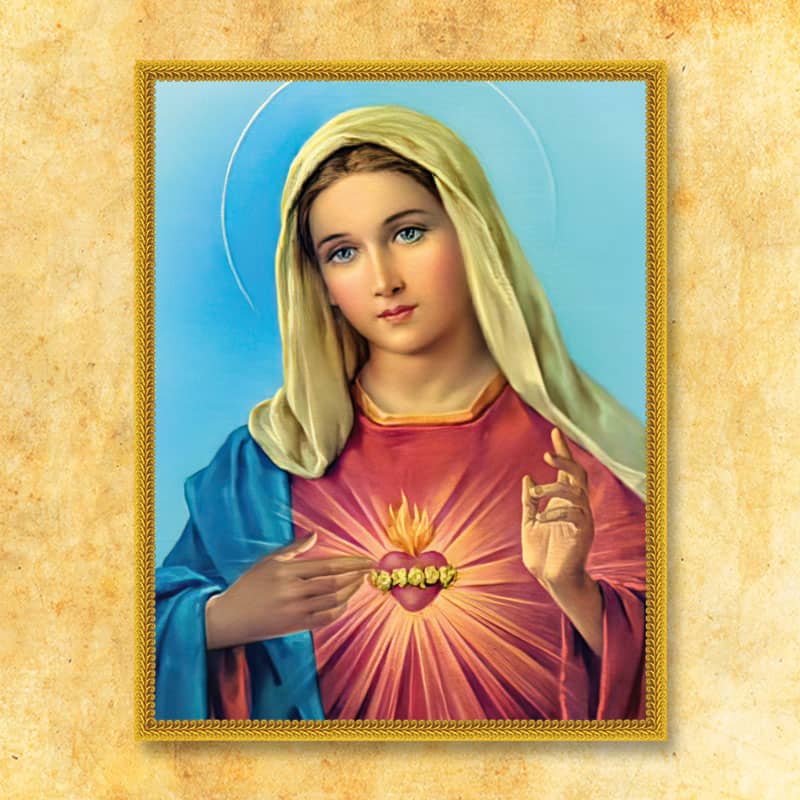 La simbologia del cuore illuminato, del gesto di benedizione e dello sguardo gentile ricorda l’amore e la protezione della Madre della Chiesa. L’immagine rimane leggibile anche da una maggiore distanza, mantenendo eleganza e dignità sacra.