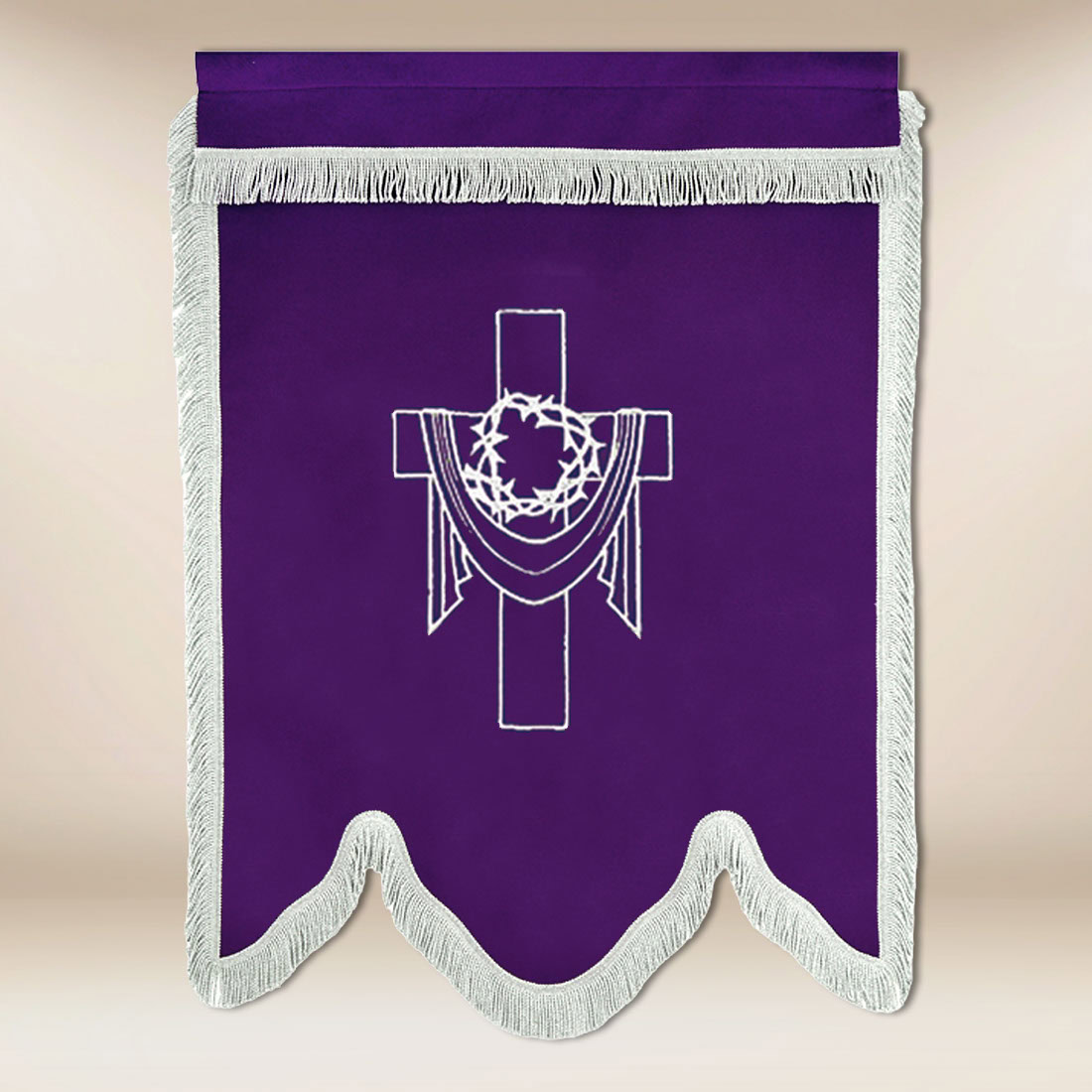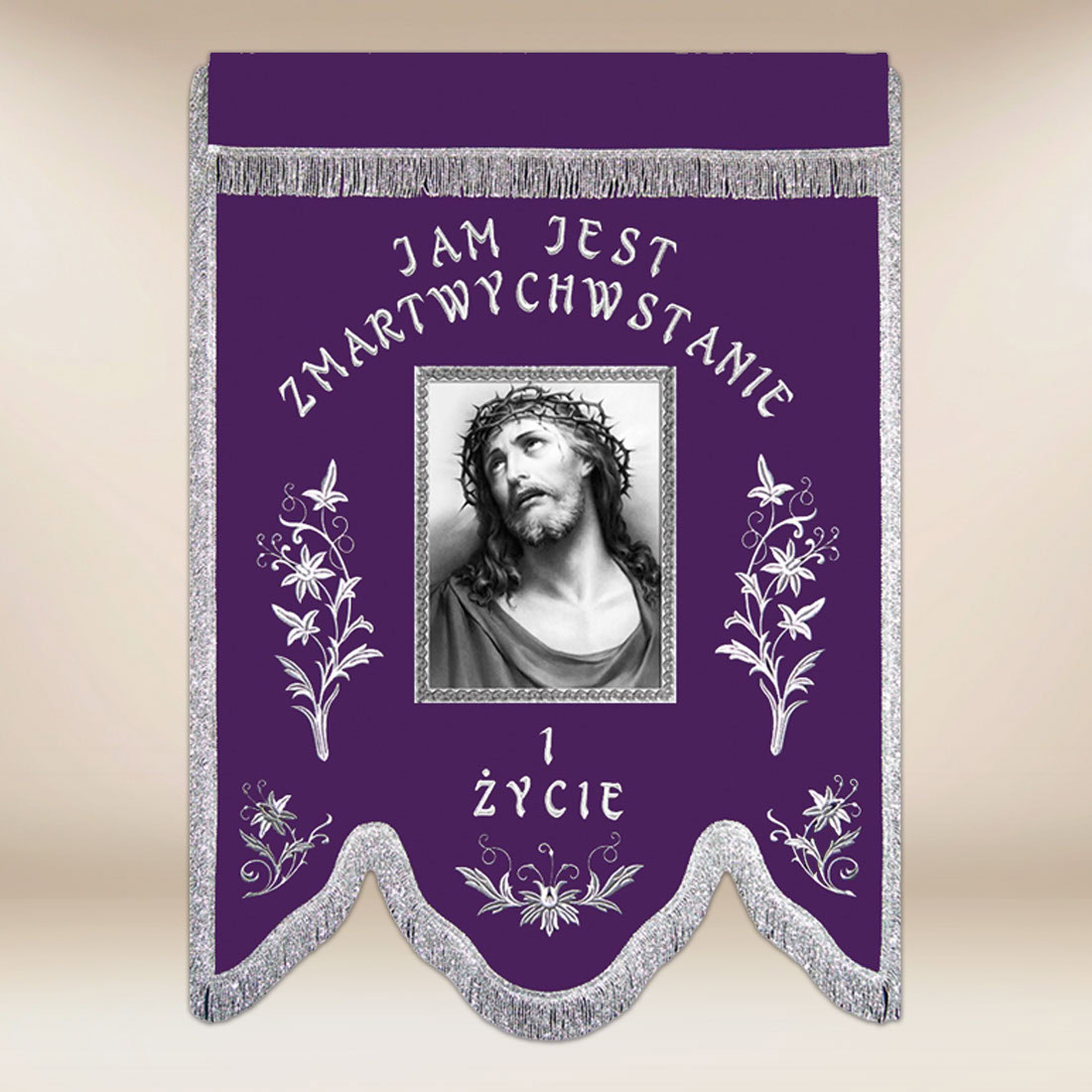 L’insegna è realizzata in tessuto di alta qualità, durevole, resistente all’uso frequente e alla conservazione prolungata. Frange argentate finemente rifinite e una passamaneria elegante attorno all’immagine conferiscono un carattere rappresentativo all’insieme. Cuciture solide, dettagli precisi e una forma armoniosa fanno sì che l’insegna mantenga la sua bellezza per molti anni. L’insegna funebre “Gesù Sofferente” unisce la semplicità liturgica all’eleganza, introducendo i fedeli nel silenzio della preghiera, nella riflessione e nella speranza che scaturisce dalla fede cristiana.