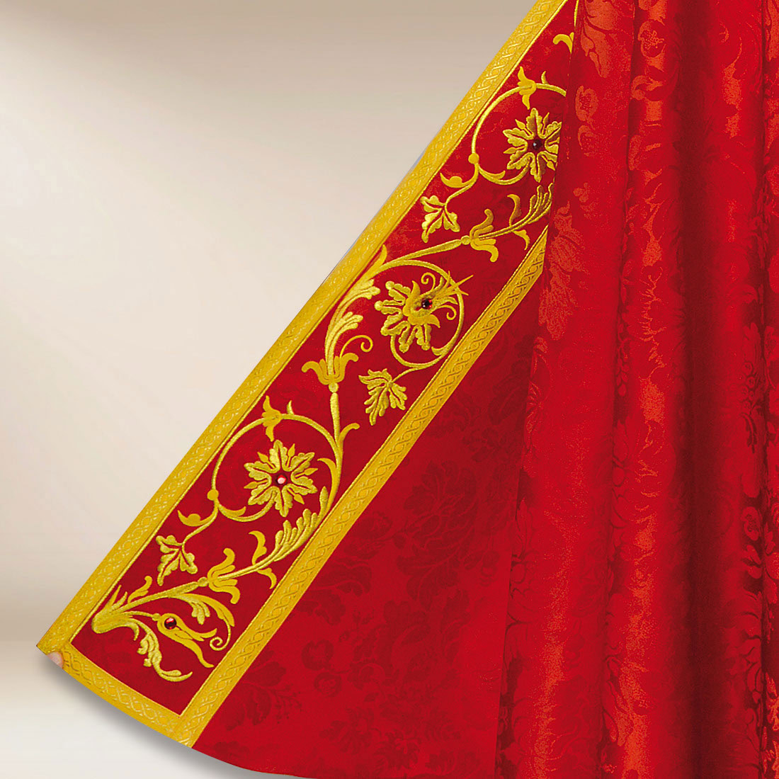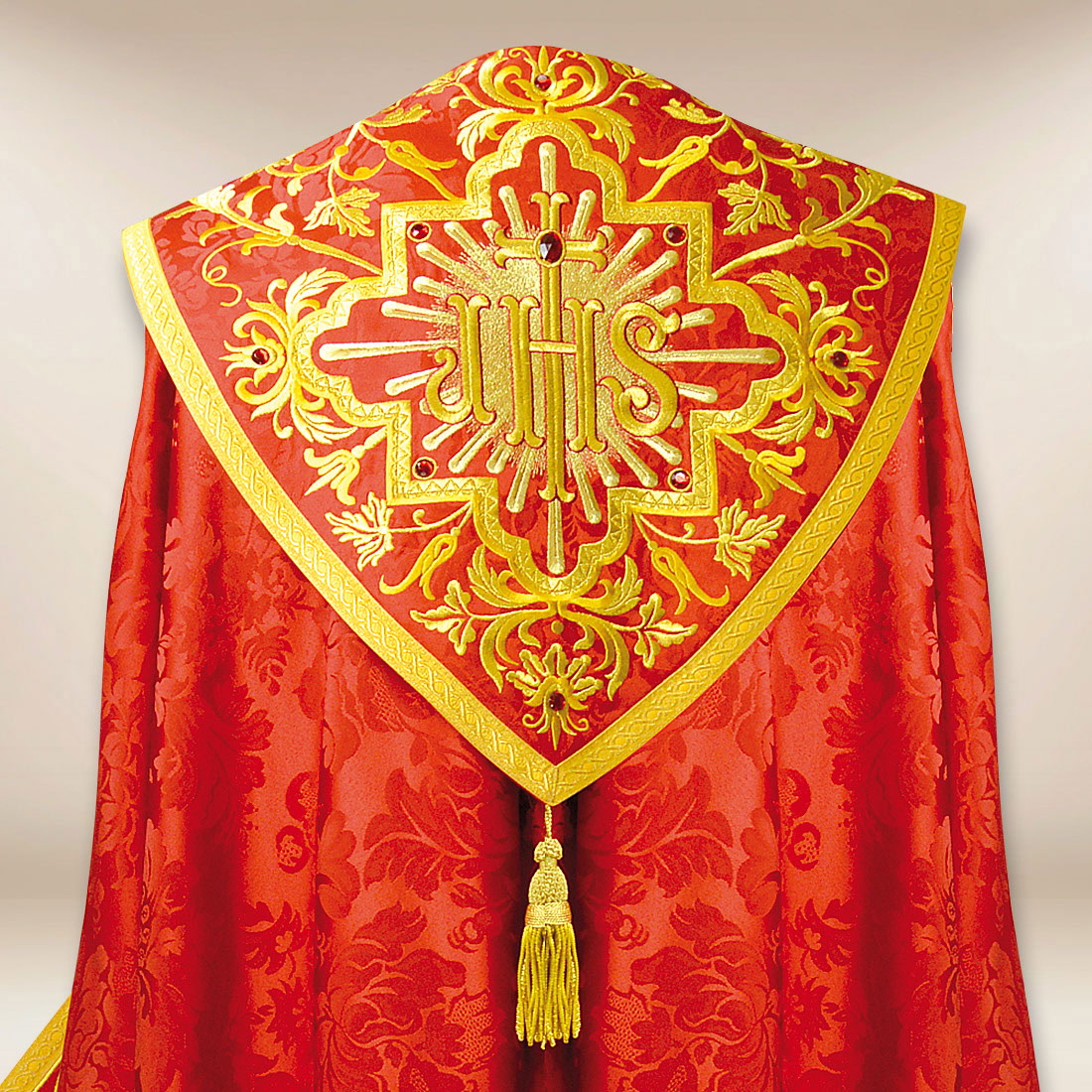 Il piviale liturgico rosso IHS ricamato è un abito pensato per le celebrazioni solenni, in cui eleganza, solennità e precisione di realizzazione sono particolarmente importanti. È realizzata in tessuto jacquard di alta qualità dalla struttura delicata e morbida, rifinita in modo da cadere armoniosamente e naturalmente durante la liturgia. La sua superficie è decorata con un sottile motivo floreale che conferisce alla veste il carattere di una decorazione sacra, senza introdurre esagerazioni o contrasti eccessivi.