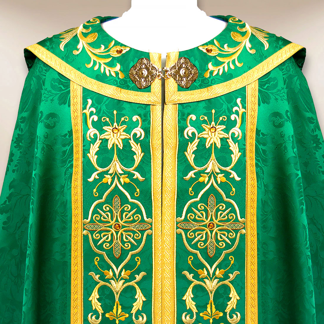 Il piviale liturgico ricamato verde è stato realizzato in tessuto jacquard di alta qualità con una trama floreale sottile che gli conferisce un carattere nobile. Il tessuto del piviale ricamato verde cade morbido e armonioso, conferendo all’abito un aspetto elegante sia nei movimenti che nei momenti statici della celebrazione. Il ricamo, accuratamente elaborato, è stato inserito in modo da sottolineare la composizione dell’intero piviale, mantenendo l’equilibrio tra la ricchezza delle decorazioni e la dignità liturgica della forma. Il piviale liturgico ricamato verde presenta anche ulteriori accenti sotto forma di pietre applicate a mano che conferiscono all’insieme un bagliore tenue, caratteristico degli abiti destinati alle cerimonie solenni.