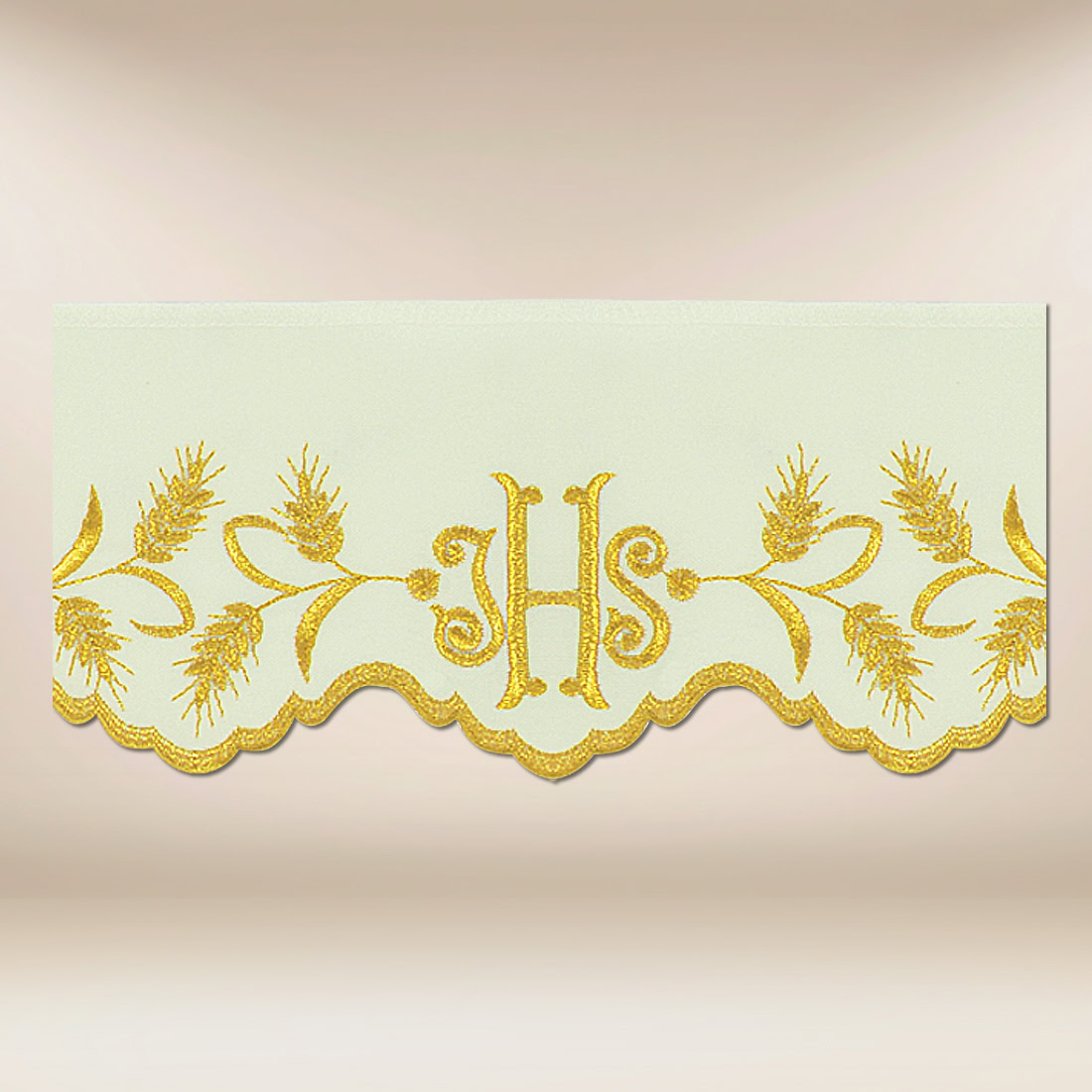Pizzo sacro ricamato ecru 590 cm. Il motivo IHS circondato da spighe rimanda alla simbologia eucaristica del pane e conferisce al presbiterio un carattere coerente e solenne. Il ricamo è sottile ma allo stesso tempo espressivo, svolgendo così una funzione decorativa senza dominare l’arredamento.