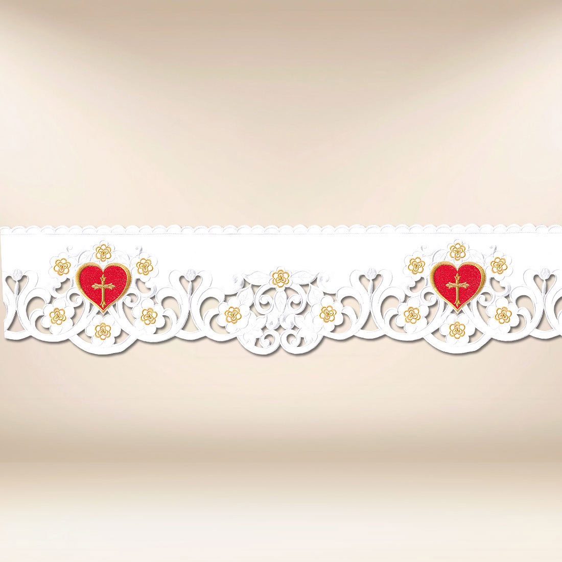Il modello “Cuore di Gesù” è particolarmente indicato durante le funzioni religiose di giugno, le celebrazioni dedicate al culto del Cuore di Gesù, l’adorazione del Santissimo Sacramento e le celebrazioni durante tutto l’anno liturgico. Può essere utilizzato come rifinitura decorativa per tovaglie d’altare, copritavoli o altri tessuti sacri, conferendo al tempio armonia e profondità spirituale.