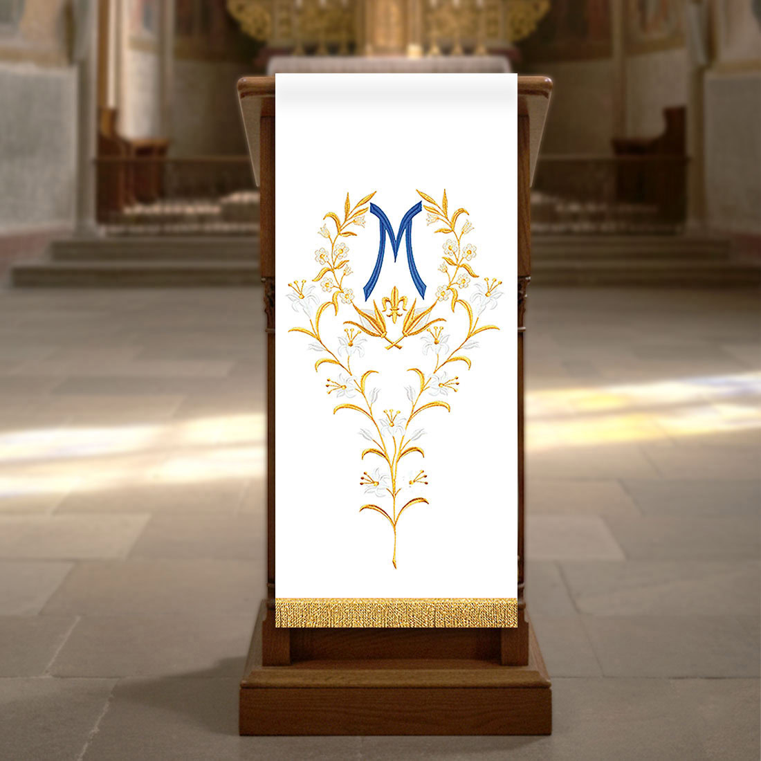 Il motivo decorativo centrale è il monogramma ricamato di Maria “M”, realizzato in una composizione armoniosa con delicati motivi floreali simmetrici. L’ornamentazione rimanda alla purezza, all’umiltà e alla bellezza spirituale della Madre di Dio, creando un messaggio teologico chiaro e allo stesso tempo sottile. Il ricamo è chiaro e ben visibile da lontano, grazie al quale il leggio svolge non solo una funzione decorativa, ma anche simbolica.