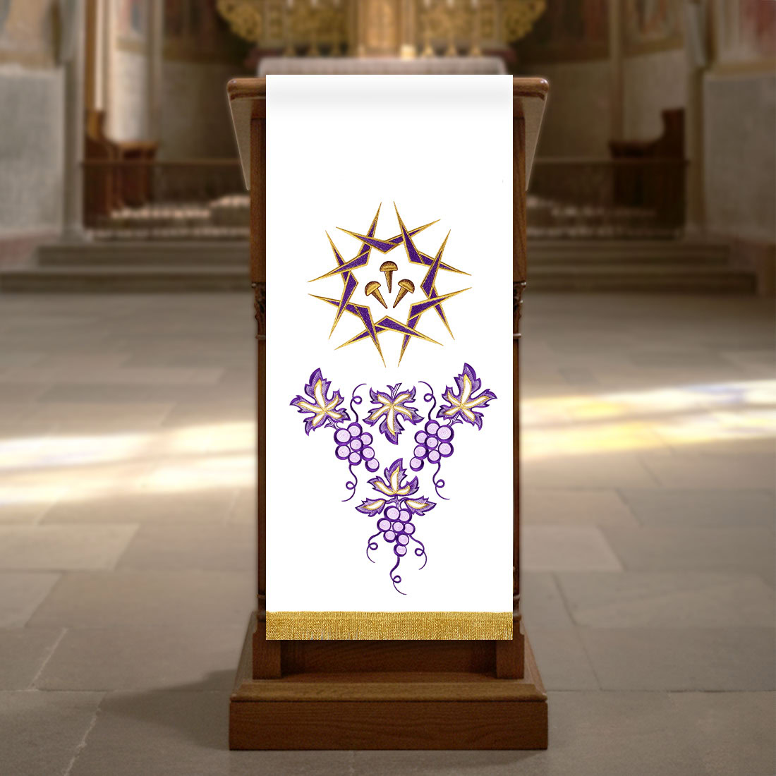 Il leggio ricamato quaresimale è un elemento decorativo liturgico accuratamente progettato, destinato a sottolineare il carattere unico del periodo quaresimale. Posizionato sul lettorio, diventa un segno evidente della preparazione spirituale all’arrivo di Cristo, introducendo i fedeli in un clima di silenzio, riflessione e preghiera. Le sue proporzioni – 55 cm x 150 cm – lo rendono perfetto per l’ambone, in armonia con l’arredamento del presbiterio.