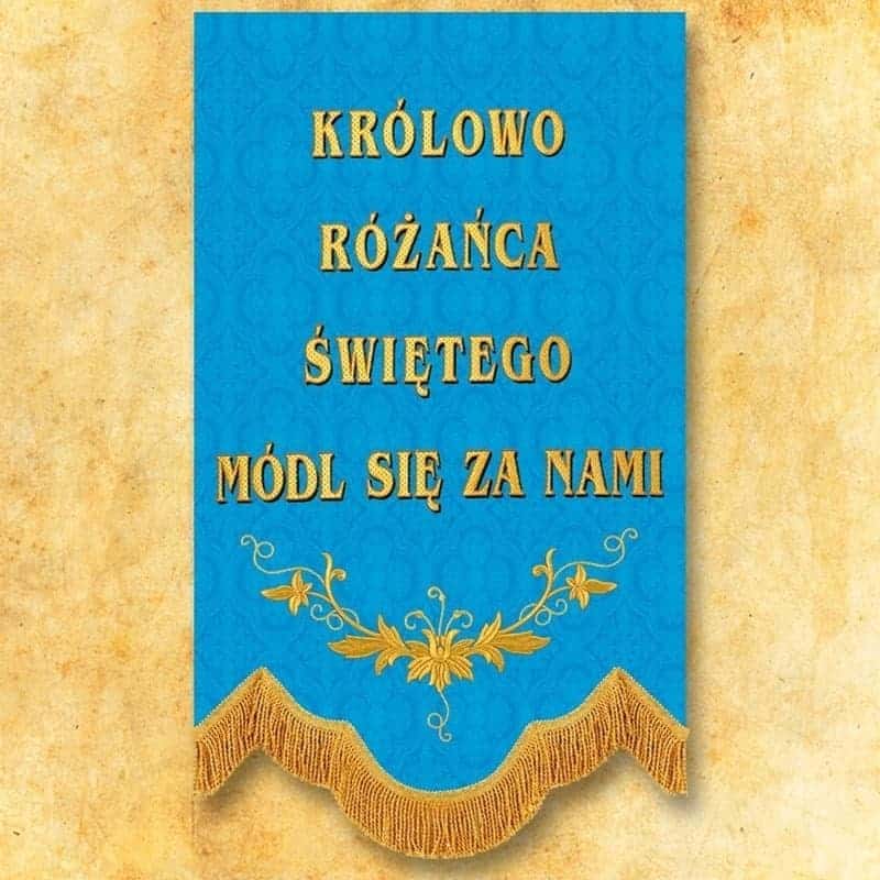 La mini bandiera con l’immagine di Matka Boża Różańcowa è realizzata in jacquard resistente, resistente alle deformazioni e all’uso intensivo. Le frange dorate e la cura nei dettagli conferiscono eleganza liturgica. Si adatta perfettamente a celebrazioni mariane, incontri del rosario di ottobre e festività parrocchiali. È possibile personalizzarla, ad esempio, aggiungendo il nome della parrocchia o della comunità.