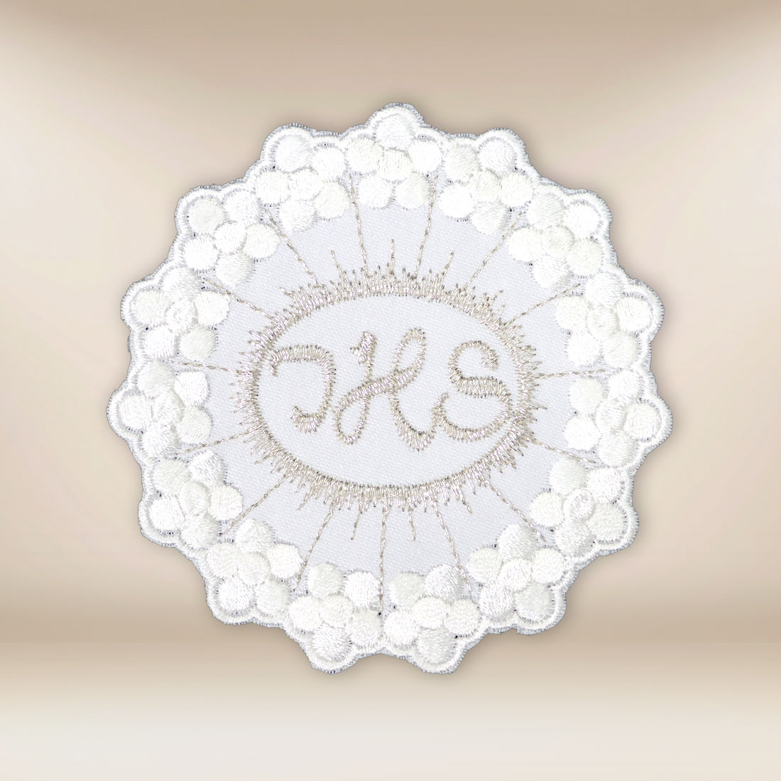 La composizione dell’applicazione si basa su una forma armoniosa e circolare dell’ostia, circondata da un delicato ornamento raggiato. Il monogramma IHS posto centralmente attira l’attenzione e sottolinea il carattere eucaristico della decorazione, mantenendo al contempo sobrietà e dignità liturgica. L’insieme è stato progettato per non dominare il vestito, ma per completarlo con eleganza.