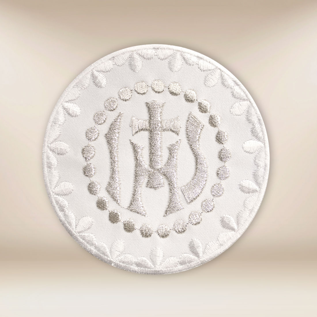 L’ostia comunionale da applicare è realizzata con filati di ricamo accuratamente selezionati, il che garantisce durata, finitura estetica e resistenza all’uso durante le cerimonie. Il punto di cucitura, eseguito con precisione, restituisce la forma delle lettere e dell’ornamento, mantenendo un contorno chiaro e proporzioni armoniose. Il diametro di 8 cm rende l’applicazione sottile, ma allo stesso tempo ben visibile sull’abito.