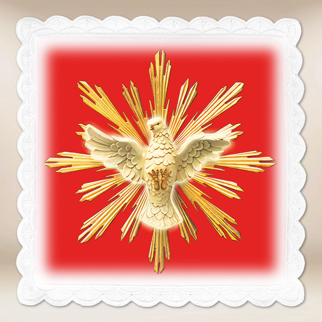Palla fotografica Duch Święty gołębica è stata progettata come un elemento nobile della biancheria per calice, che unisce la funzione pratica a un forte messaggio teologico. Il suo compito è quello di coprire dignitosamente il calice mszalny e di sottolineare il carattere sacramentale dell’Eucaristia.
