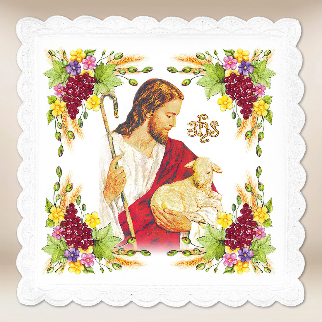 La palla fotografica rappresenta l’immagine di Cristo Buon Pastore, che porta sulle spalle un agnello – simbolo di cura, amore e misericordia verso ogni uomo. Gesù, vestito con una tunica bianca e un mantello rosso, tiene in mano un pastorale, e il Suo volto sereno emana dolcezza e pace. Nella parte centrale si trova il monogramma dorato IHS, che indica il nome di Gesù. La composizione è circondata da una ricca corona di grappoli d’uva, foglie e spighe di grano – motivi eucaristici che simboleggiano il Corpo e il Sangue di Cristo. Il tutto è mantenuto in una calda e armoniosa colorazione, su uno sfondo di bianco puro.