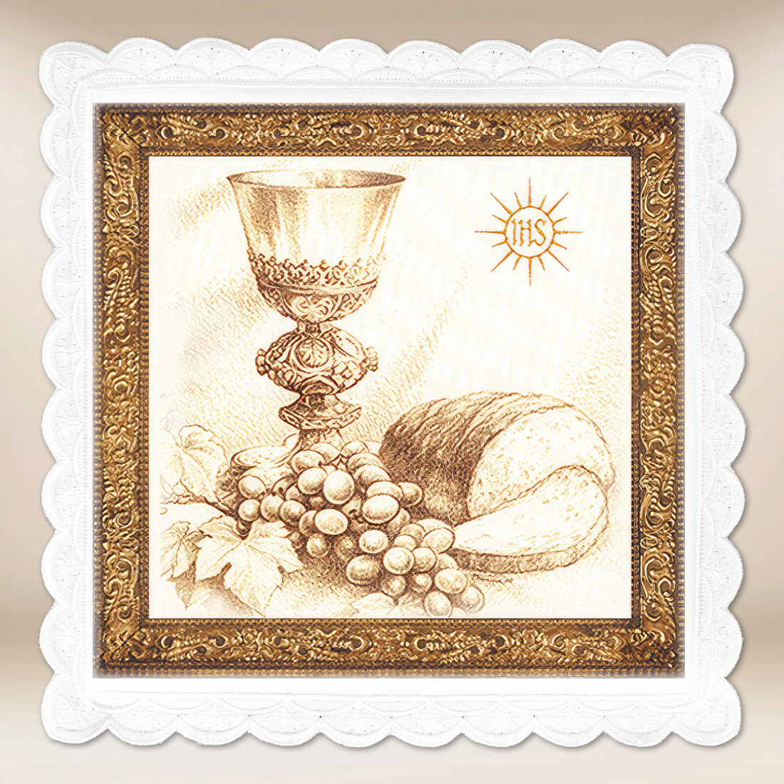 Palla fotografica presenta una composizione classica, tonificata in seppia, con simboli dell’Eucaristia – calice, pane e grappoli d’uva. Nella parte superiore è visibile il monogramma IHS, che rappresenta l’abbreviazione del nome Gesù, circondato da raggi dorati di luce. La sottile ombreggiatura e lo stile artistico del disegno conferiscono all’intera scena un carattere sacro e unico, richiamando le tradizionali rappresentazioni eucaristiche presenti nell’arte ecclesiastica. La calda tonalità oro-bruna sottolinea la profondità spirituale del motivo, mentre la cornice elegante aggiunge un’impressione di icona.