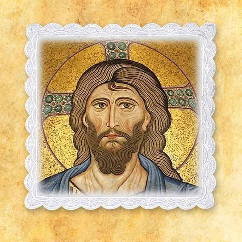 Palla fotografica Cristo Pantocratore è stata progettata come elemento della biancheria per calice, che unisce funzione pratica e profonda contenuto teologico. Destinata a coprire il calice della Messa, ordina lo spazio dell’altare e introduce nella liturgia un segno distintivo della presenza di Cristo.