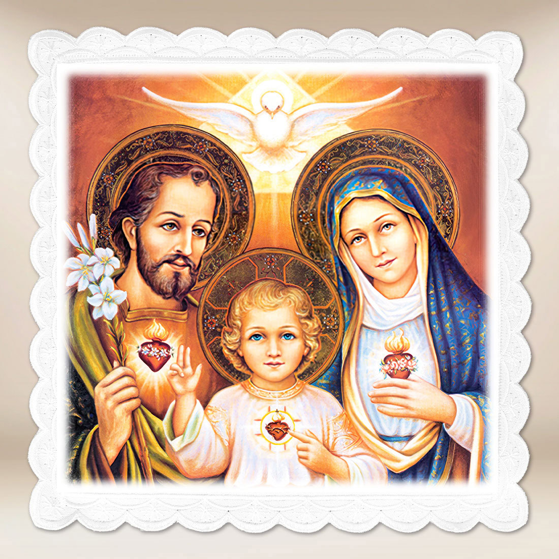 Palla fotografica è un elemento unico della biancheria per calice che rappresenta la Sacra Famiglia – Gesù, Maria e Giuseppe – circondati dai raggi dello Spirito Santo. Questa bella immagine simboleggia l’amore, l’unità e la benedizione che derivano dalla vita nella fede. La calda colorazione e i dettagli sottili creano una composizione armoniosa, che porta a ogni liturgia una profondità spirituale e un’atmosfera di preghiera.