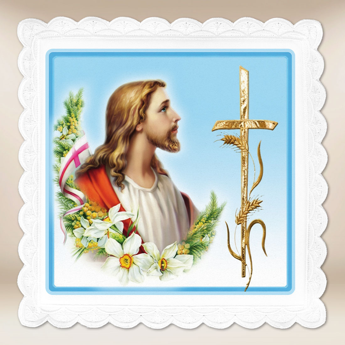 La palla fotografica è un elemento unico della biancheria per calice, che unisce la bellezza della simbolica sacra e la moderna tecnica di realizzazione. Rappresenta l’immagine di Gesù Cristo circondato da fiori e dalla croce – simbolo della Risurrezione, della vittoria della vita sulla morte e della redenzione del mondo. La sottile combinazione dello sfondo azzurro con i colori caldi delle figure conferisce all’insieme una profondità eccezionale e una dimensione spirituale.