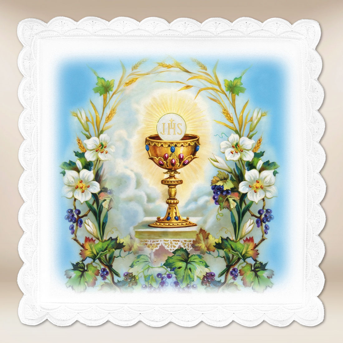 La palla fotografica è un elemento unico della biancheria per calice, decorata con un motivo artistico eucaristico che rappresenta il calice con l’Ostia circondato da gigli, spighe di grano e grappoli d’uva. La composizione, mantenuta in delicate tonalità di blu, oro e verde, simboleggia la purezza, il sacrificio e la pienezza spirituale, integrandosi perfettamente nel carattere sacro della liturgia.