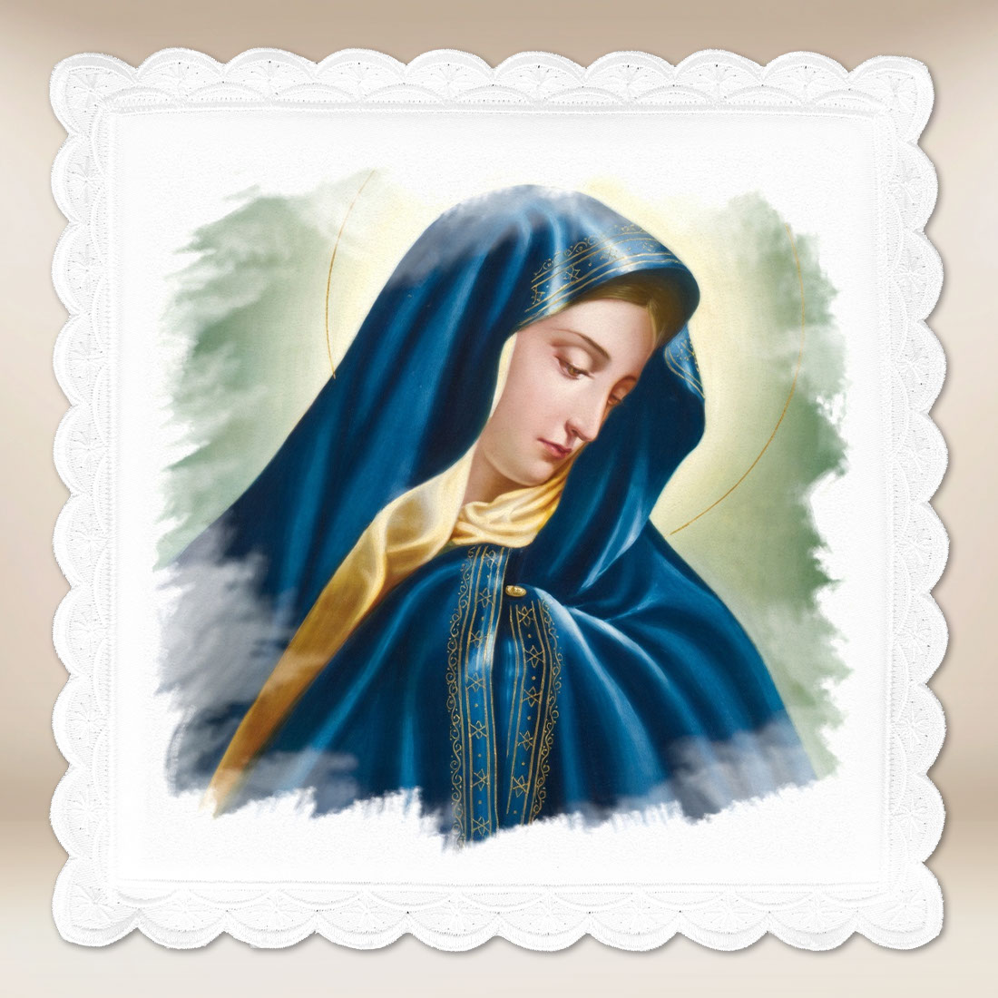 Palla fotografica è una palla liturgica unica che rappresenta l’immagine della Madonna in una contemplazione serena e orante. Mantenuta in delicate sfumature di blu e oro, simboleggia la purezza, l’umiltà e la protezione spirituale di Maria sulla Chiesa. Il suo volto pieno di dolcezza emana calma e profonda spiritualità, creando un’atmosfera di concentrazione durante ogni celebrazione eucaristica.