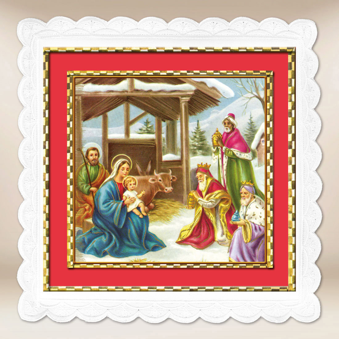 La palla è realizzata in tessuto liturgico bianco di alta qualità con una struttura satinata, resistente alle deformazioni e ai frequenti lavaggi. La stampa fotografica precisa garantisce la durata dei colori e l’ottima riproduzione dei dettagli. Il tutto è decorato con un delicato bordo in pizzo color ecrù e una elegante cornice rossa, che sottolinea il carattere festivo della rappresentazione.