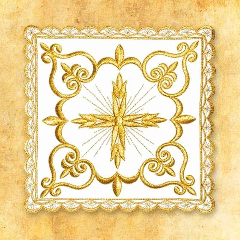 L’elemento decorativo centrale è una croce ricamata, inserita in una ricca composizione ornamentale simmetrica. Il simbolo della croce costituisce un riferimento fondamentale al Sacrificio di Cristo e al mistero dell’Eucaristia, e la sua accurata elaborazione sottolinea la dimensione sacrale della celebrazione. I delicati dettagli del ricamo conferiscono alla palla un carattere solenne e armonioso, che si integra perfettamente con l’arredamento dell’altare.