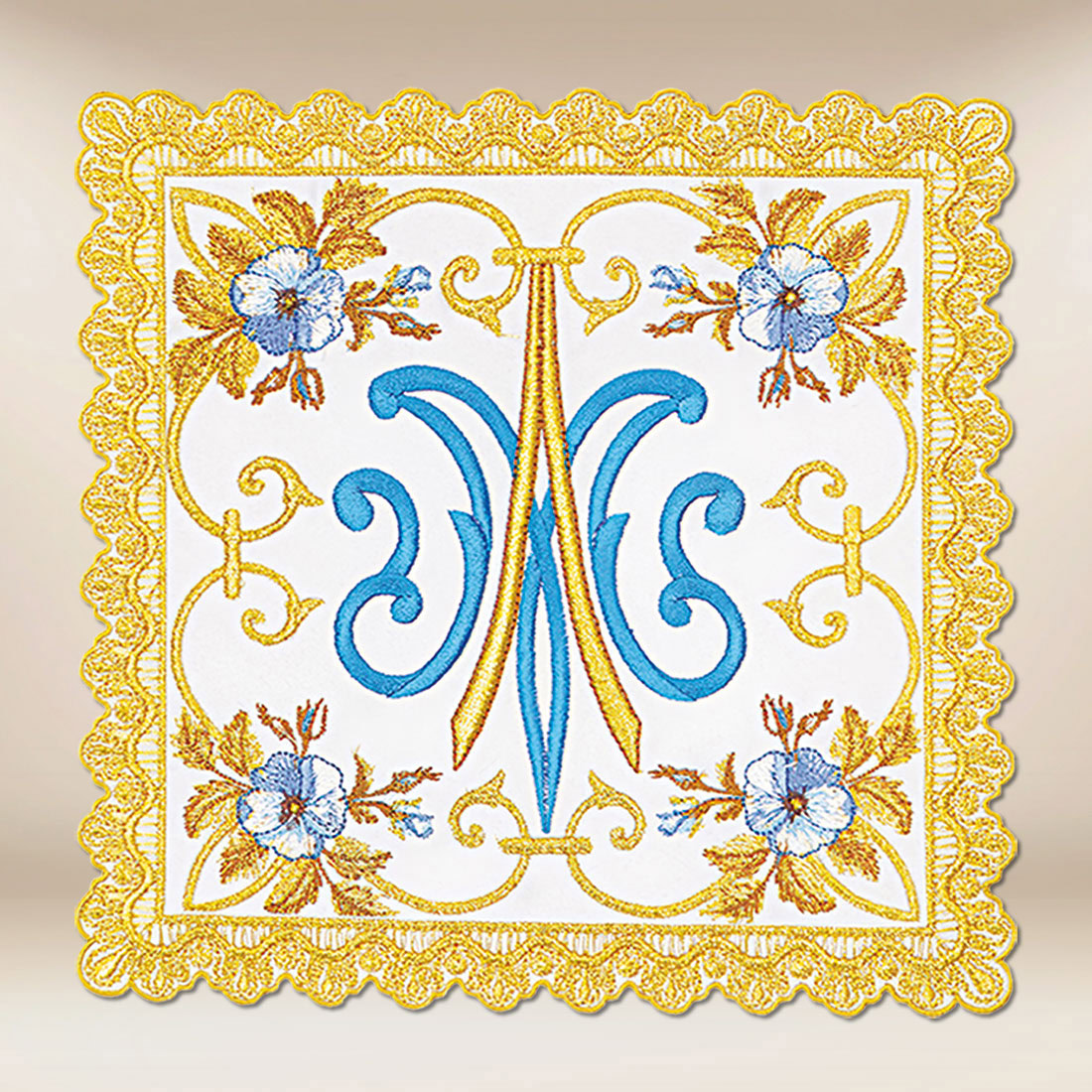 Palla ricamata con filo dorato è un elemento unico della biancheria per calice, che unisce la bellezza del ricamo tradizionale con la profonda simbolica mariana. Il motivo centrale è decorato dalla lettera “M” in colore azzurro – simbolo della Madonna – circondata da ornamenti dorati e delicati fiori in tonalità di blu e oro. Il tutto crea una composizione armoniosa ed elegante, che in modo sottile richiama la purezza, l’umiltà e la bellezza spirituale di Maria.