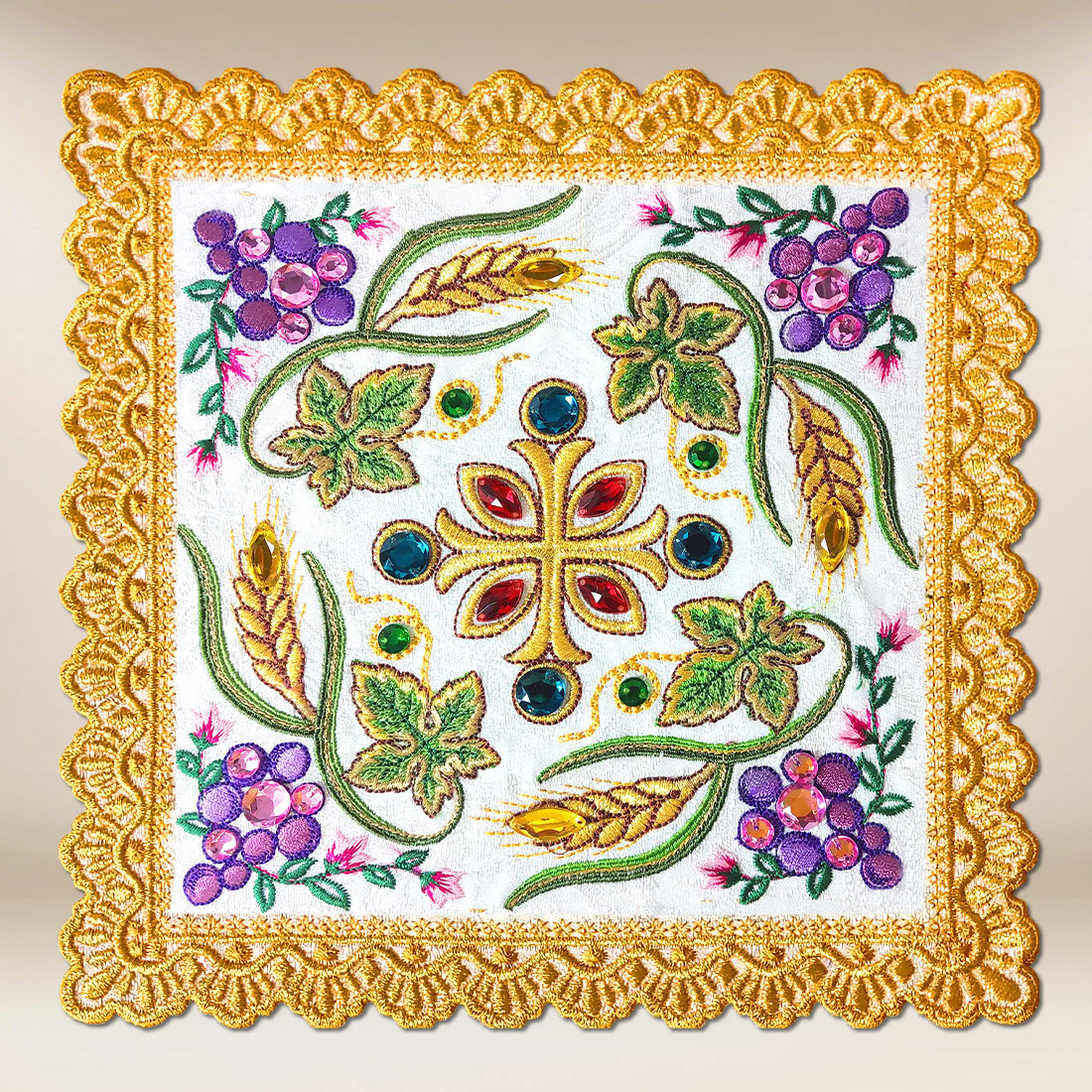 Palla ricamata Croce „Pretiosus” è un elegante e straordinariamente decorativo elemento della biancheria per calice, che incanta per la ricchezza dei colori e la precisione della realizzazione. Al centro della composizione si trova una croce dorata decorata con pietre colorate, simbolo della gloria e del maestà di Cristo. Il ricamo è completato da motivi di grappoli d’uva, foglie e spighe di grano, creando un insieme armonioso e simmetrico con una profonda simbologia eucaristica.