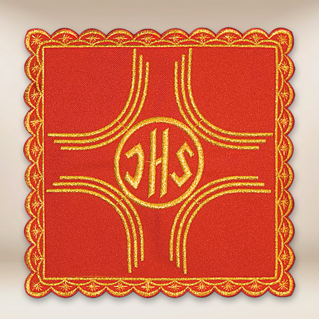 Palla ricamata rossa è un elegante elemento di biancheria per calice, realizzato in tessuto liturgico di alta qualità in un intenso colore rosso. Decorata con ricamo dorato con il simbolo IHS inscritto in un motivo geometrico, rappresenta una fusione di classicismo, simbolismo eucaristico e straordinaria precisione di esecuzione.