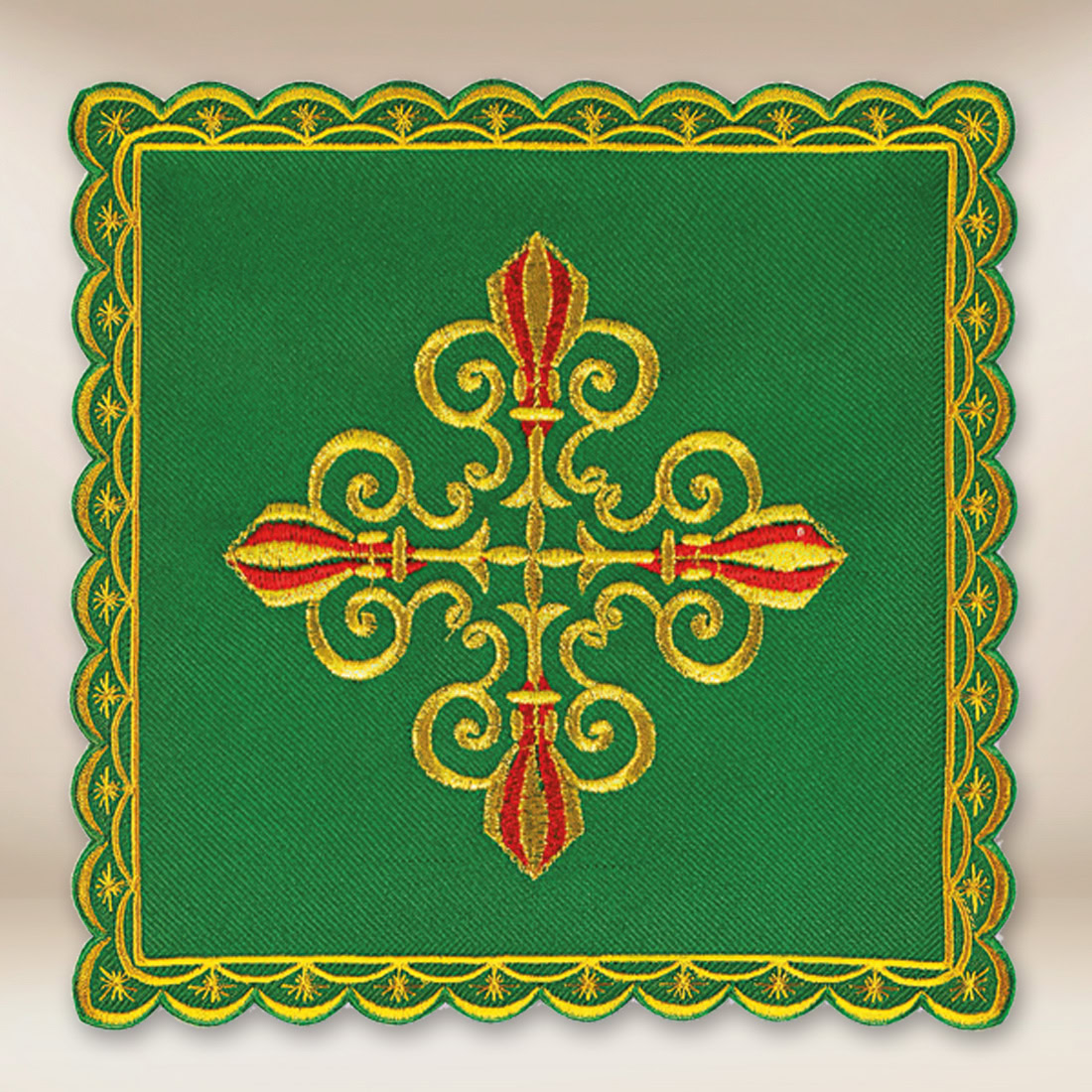 Palla ricamata verde è un elegante elemento di biancheria per calice, realizzato in tessuto liturgico di alta qualità in una profonda tonalità di verde. Decorata con ricamo dorato a forma di croce decorativa con braccia stilizzate, simboleggia la fede, la speranza e la rinascita spirituale in Cristo. L’armonica combinazione di verde e oro sottolinea il carattere solenne del prodotto.