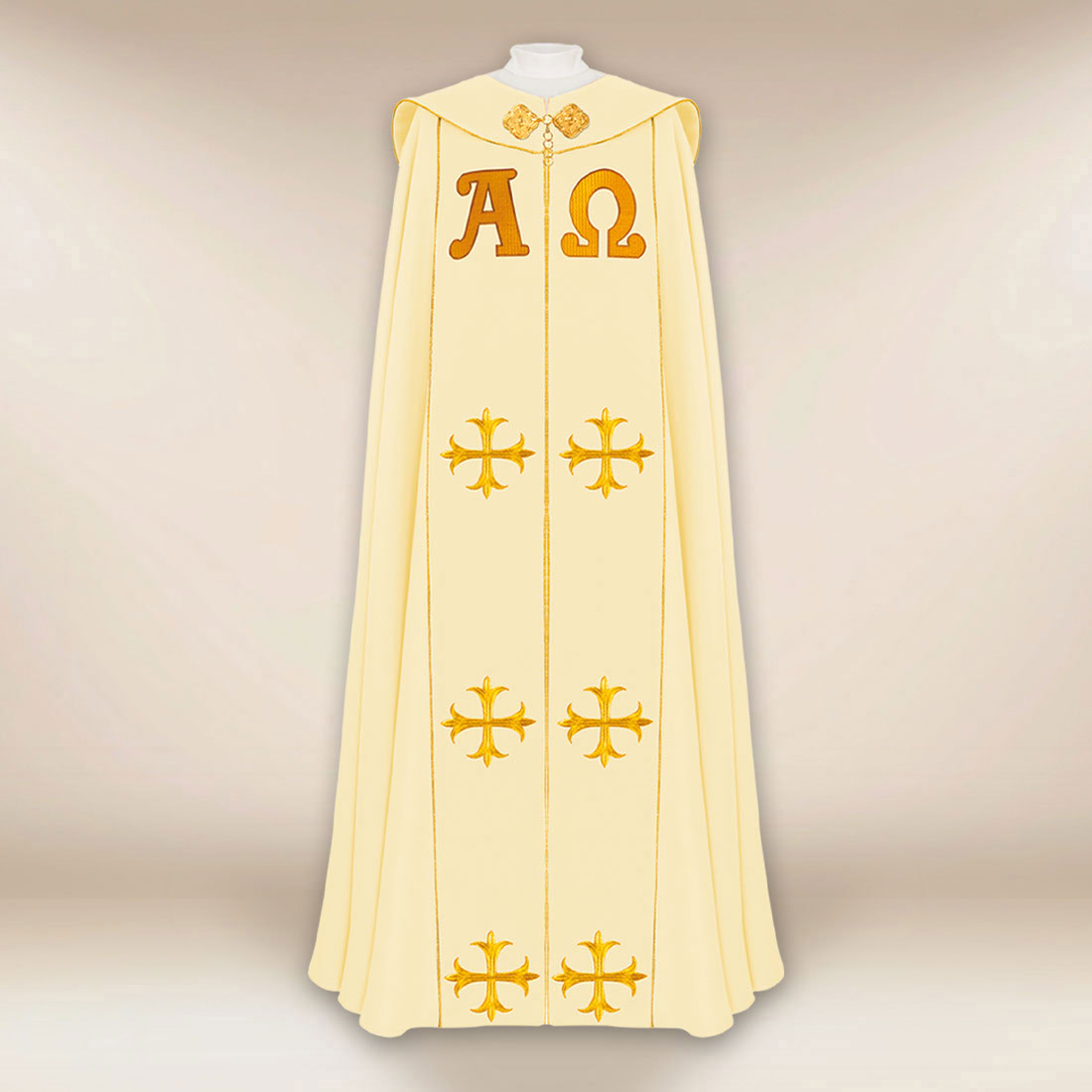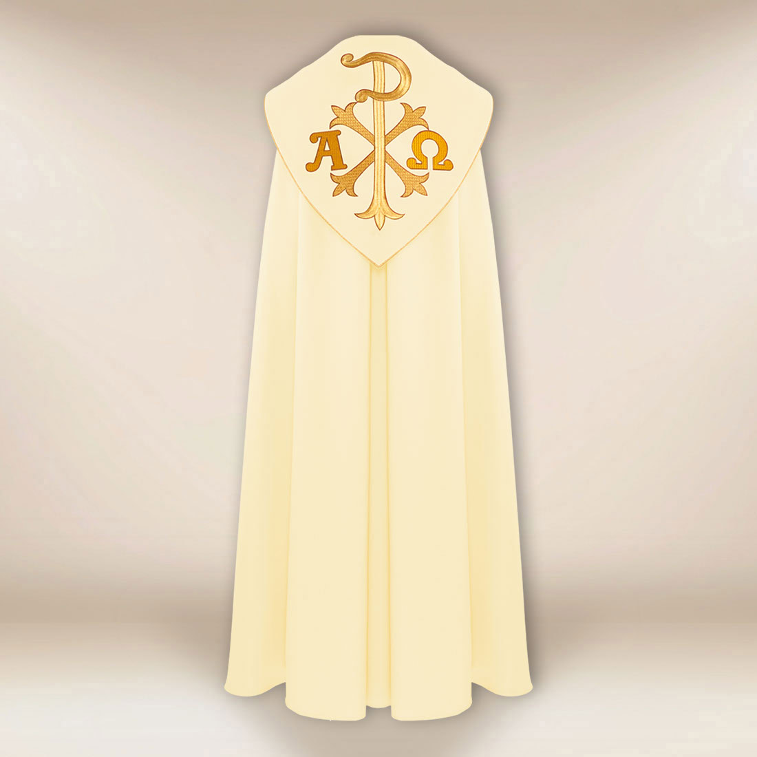 Piviale liturgico ecru Alfa Omega PX è un modello che unisce l’eleganza delle tradizionali vesti ecclesiastiche con una vivace simbologia cristologica. Realizzato in tessuto di alta qualità satin-taffetà, si presenta in modo estremamente nobile grazie al suo delicato lucido e alla morbida struttura. Il tessuto si adatta leggermente, il che consente alla veste di mantenere il suo carattere solenne durante le processioni e le celebrazioni più lunghe.