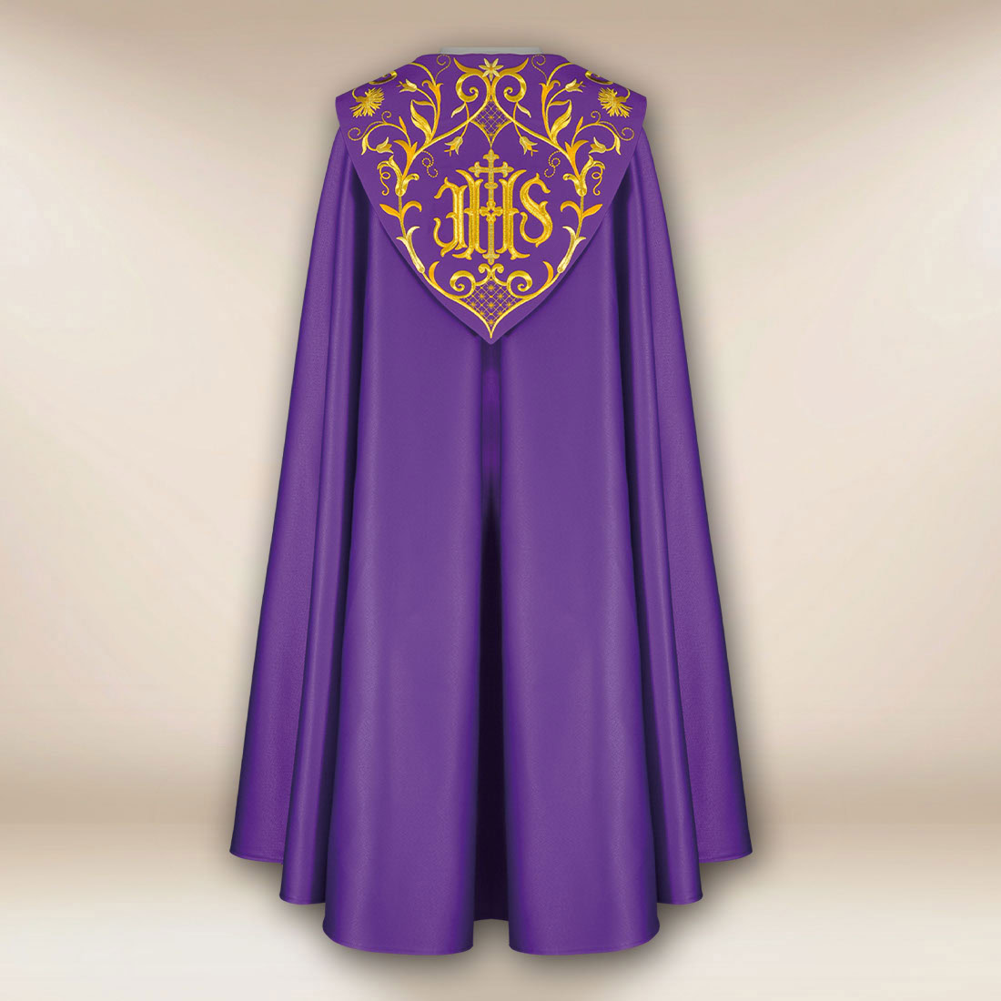 Piviale ricamato viola IHS è stato rifinito con cura, prestando attenzione a ogni dettaglio, affinché si presenti in modo rappresentativo in ogni contesto liturgico. La taglia universale garantisce una vestibilità comoda e un elegante drappeggio su ogni silhouette del celebrante.