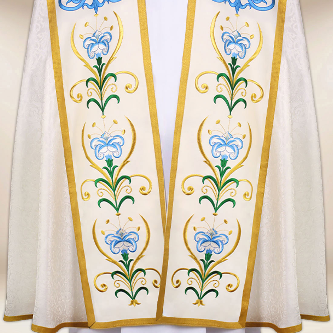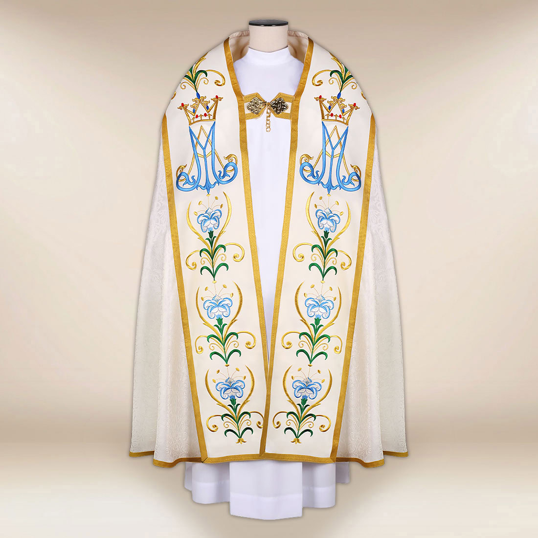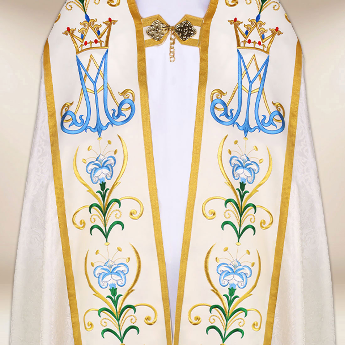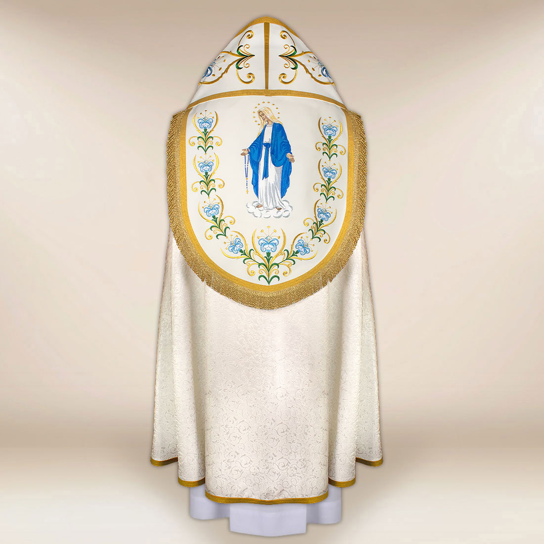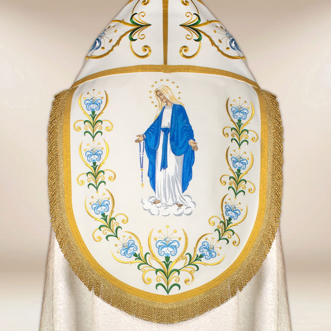 Piviale con motivo Madonna del Rosario è stata creata per le solenni celebrazioni mariane, le processioni e le funzioni religiose in cui è particolarmente importante un contesto dignitoso e bello. Il paramento è stato realizzato in tessuto jacquard di alta qualità in un’elegante tonalità ecru, che si distingue per la sua struttura sottile e la lucentezza naturale. La sua morbida drappeggiatura conferisce armonia all’insieme durante il movimento, mentre la leggerezza del materiale garantisce comfort durante il servizio prolungato.