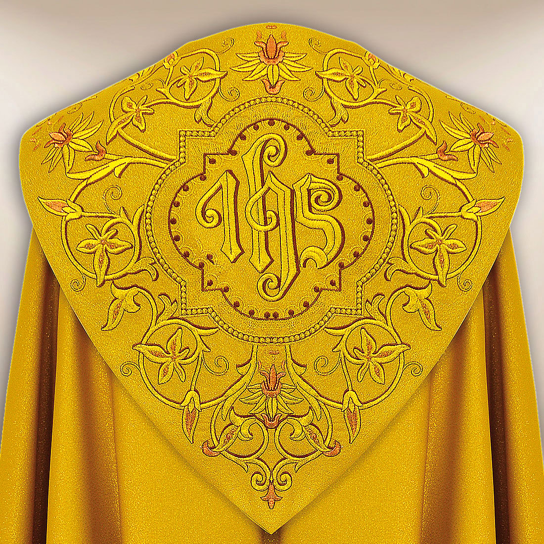 Elegante piviale ricamato oro IHS è una straordinaria veste liturgica che unisce bellezza classica, stile solenne e precisione artigianale. Realizzato in tessuto broccato di alta qualità in tonalità oro antico, noto per la sua lucentezza sottile e la struttura leggera e morbida. Questo materiale conferisce un’elegante luminosità che sottolinea perfettamente il carattere solenne delle celebrazioni liturgiche. La veste si presenta in modo estremamente armonioso sia alla luce naturale che in quella ecclesiastica, creando un effetto di coerenza con l’arredamento del presbiterio.