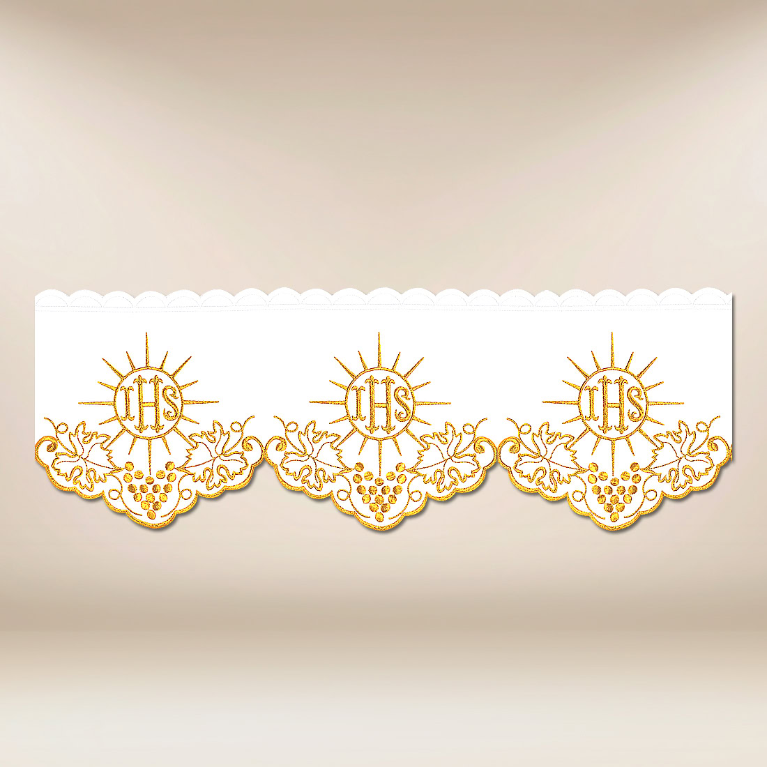 Pizzo omerale ricamato “Cristiano” è un’eccezionale proposta di decorazione liturgica, che sottolinea in modo bello ed elegante il bordo della tovaglia d’altare. Il suo ornamento si riferisce direttamente all’Eucaristia — il monogramma IHS, circondato da raggi, simboleggia la presenza di Cristo, e il motivo dei grappoli d’uva ricorda l’immagine biblica del vino come dono di Dio. Tale simbolismo fa sì che il pizzo si inserisca perfettamente nel carattere sacro della celebrazione della Santa Messa.