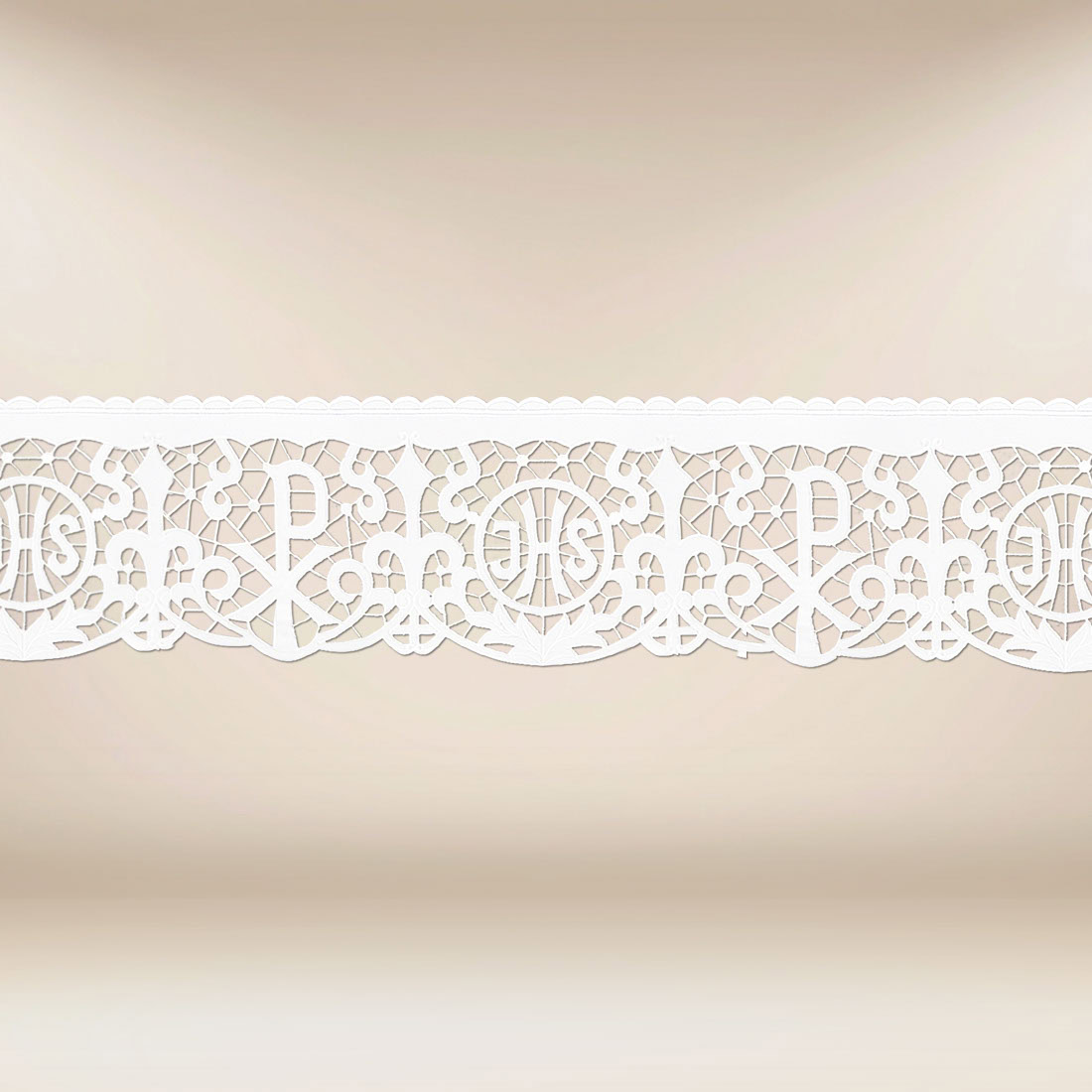 Un bellissimo pizzo ricamato con ricamo bianco motivo IHS è un elemento decorativo unico preparato appositamente per le esigenze della liturgia. La sua forma sottile ed elegante si integra perfettamente con l’arredamento di ogni chiesa, sottolineando la solennità della celebrazione e il carattere sacro dello spazio. Il motivo del ricamo rappresenta il classico simbolo IHS, uno dei più importanti monogrammi cristiani riferiti al nome di Gesù Cristo. Grazie a ciò, il pizzo svolge non solo una funzione decorativa, ma anche simbolica.